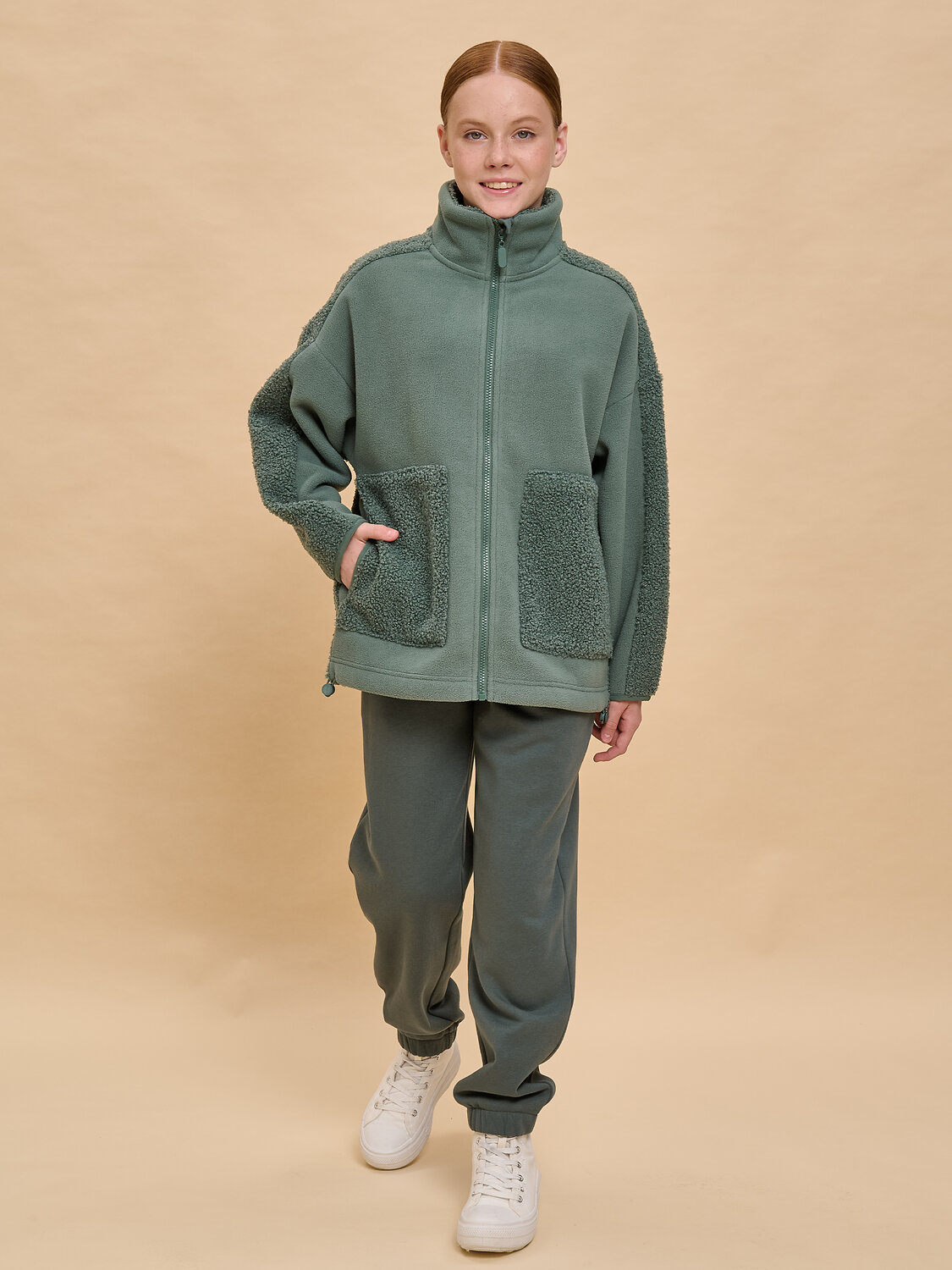 Толстовка детская для девочки выполнена из мягкого бербер-флиса (фактура «барашка»). Вставки по переду и рукавам, а также внешняя часть воротника — из футера с начесом. Сочетание материалов с разной фактурой — один из модных трендов. Куртка оверсайз-силуэта со спущенным плечом подарит ребёнку комфорт и свободу движения. Толстовка с воротником-стойкой защищает шею от холода и ветра, нет необходимости дополнительно надевать шарф. Внутренняя сторона воротника выполнена из мягкого и приятного на ощупь бербер-флиса. Спереди застёжка на центральную молнию. По низу изделия, по бокам утяжка на эластичный шнур — можно регулировать объём. Большие фигурные накладные карманы из бербер-флиса — удобно пользоваться. Зип-толстовка однотонная, без принта. За ней просто ухаживать. Одежда из бербер-флиса тёплая, лёгкая, мягкая, просто стирается и быстро сохнет, не выгорает и не скатывается, надолго сохраняет первоначальную форму. Вставки из 95% высококачественного хлопка. Он мягкий и дышащий. 5% эластана не даёт терять форму, растягиваться. Толстовка представлена в двух трендовых цветах: красный и бежевый (молочный оттенок). Она легко комбинируется с различными брюками. Размерный ряд: 1 (86): 2 (92): 3 (98): 4 (104): 5 (110): 6 (116): 7 (122): 8 (128): 9 (134): 10 (140): 11 (146). Плюшевая толстовка подходит девочкам дошкольного и младшего школьного возраста, а также девочкам-подросткам. Она идеальна для детского сада, прогулок, активного отдыха, спорта и дома. Толстовка на замке подходит для круглогодичной носки: прохладным летом, осенью, зимой, весной и демисезон. Это замечательный подарок дочери, внучке или сестре на Новый год и любой другой праздник.