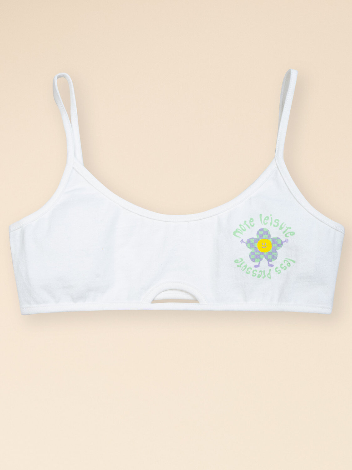 При выборе белья для своего ребёнка, каждая мама хочет быть уверена в его качестве и в том, что ребёнку будет комфортно. Наш укороченный топ для девочки полностью соответствует этим требованиям. В составе ткани преобладает хлопок — бра приятно на ощупь, великолепно пропускает воздух, кожа ребёнка дышит. Эластан обеспечивает изделию прекрасную форму надолго. Ткань отличного качества и грамотный крой — залог идеальной посадки белья. Ребёнок чувствует себя комфортно на протяжении всего дня. Тонкие мягкие бретели не сползают и не давят. Низ и проймы окантованы пайпингом в тон топа, благодаря этому они не растягиваются. Бра классического белого цвета универсально — его можно носить под любой одеждой, в том числе под белой блузкой. Модель украшена милым принтом с позитивным посылом, а также небольшим декоративным отверстием спереди по низу. Принт эластичный и стойкий, отлично переносит частые стирки. Перевод принта: "Больше досуга, меньше давления". Идеальный вариант белья для девочки-подростка! Станет замечательны