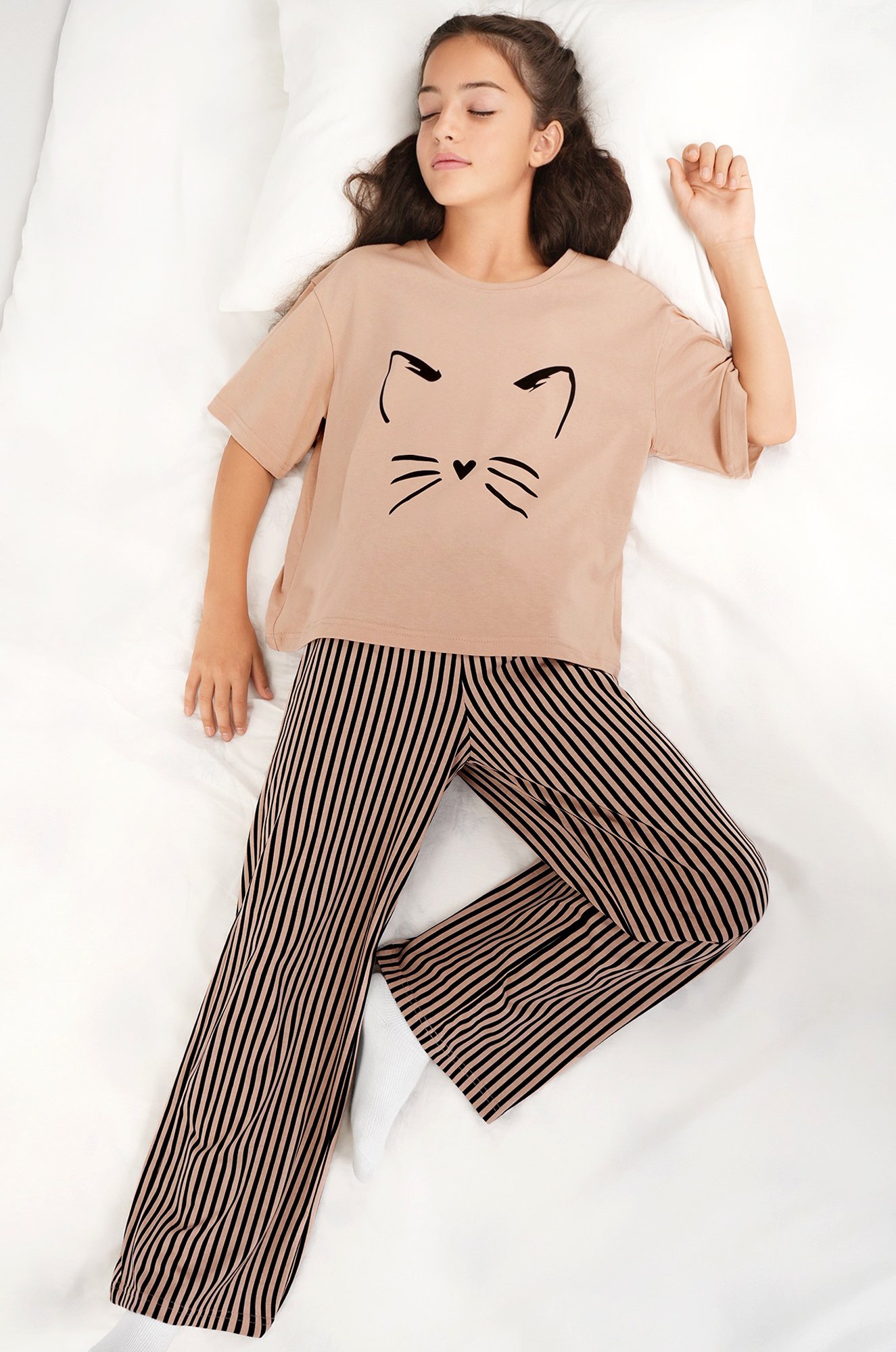 Детская пижама для девочки и девочки подростка — отличный выбор для сна и отдыха. Бежевая футболка со спущенным плечом украшена принтом Усы и ушки котика, а штаны дополнены атласным бантом на поясе и рисунком в полоску.