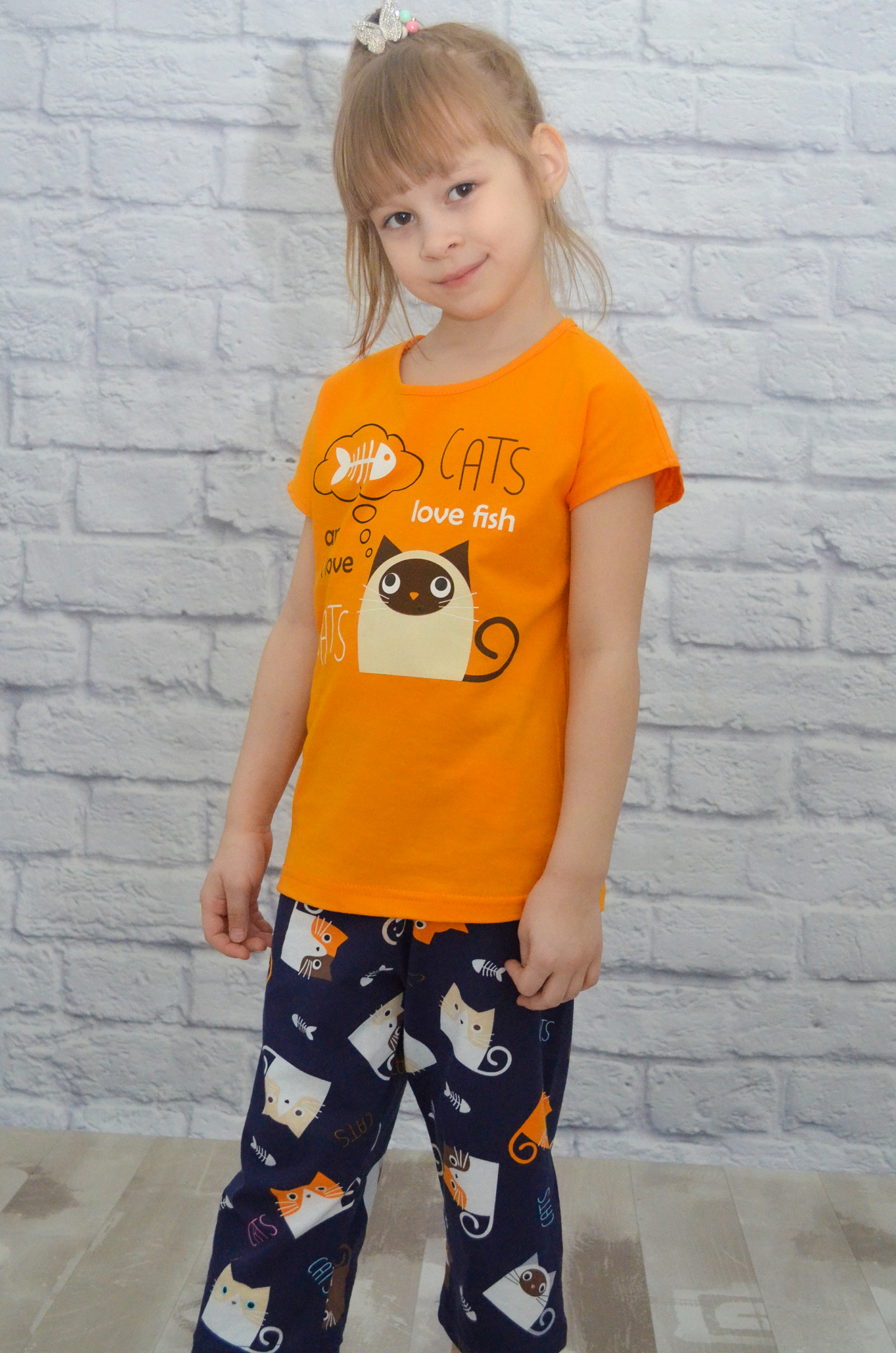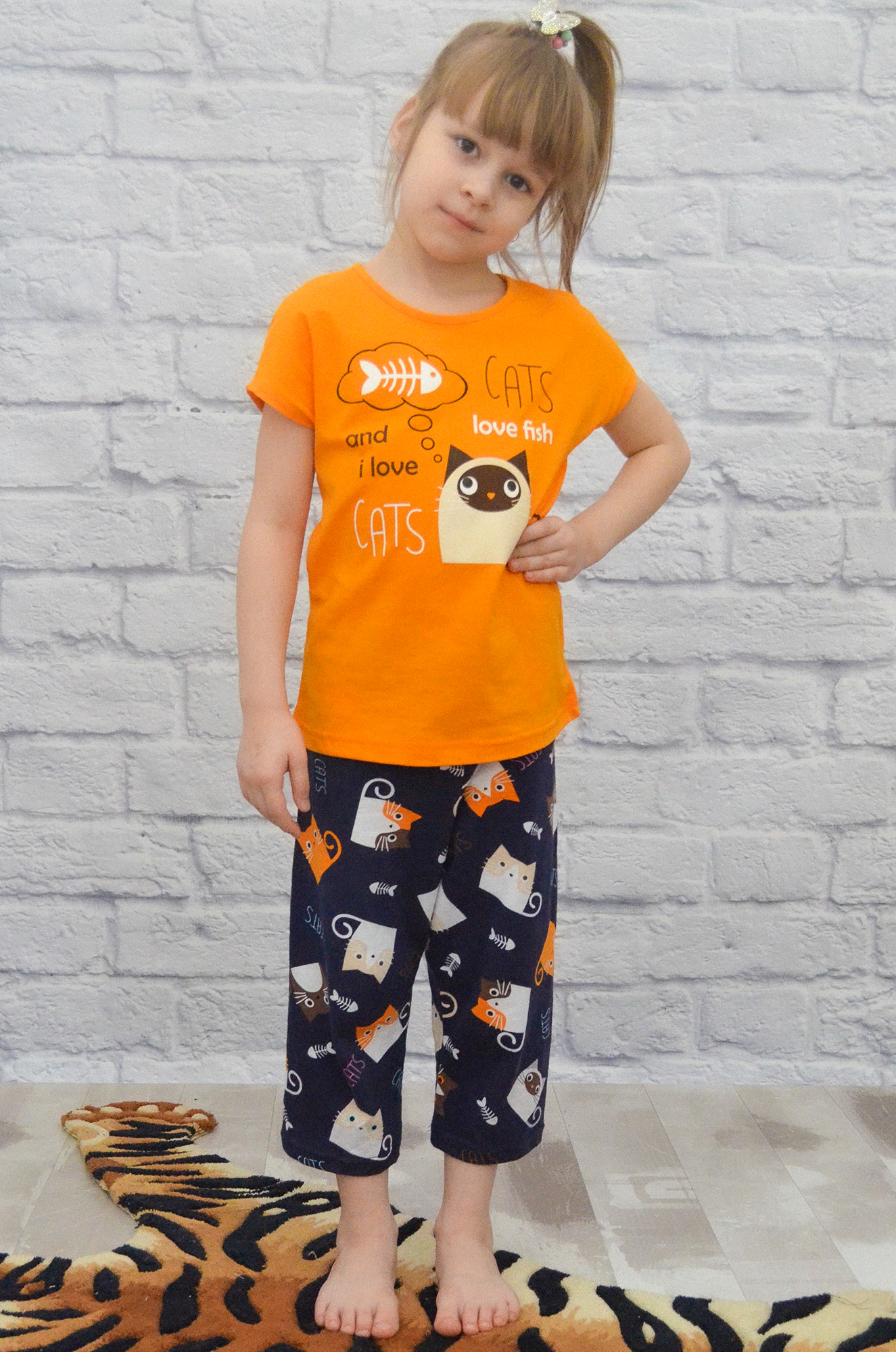 Симпатичная хлопковая пижамка для девочек. Футболка прямого кроя, с цельнокроенным рукавом, на полочке печатный принт "милый и забавный котик". Бриджи свободного кроя, пояс на резиночке. Такой комплект подойдёт и для сна, и для дома.