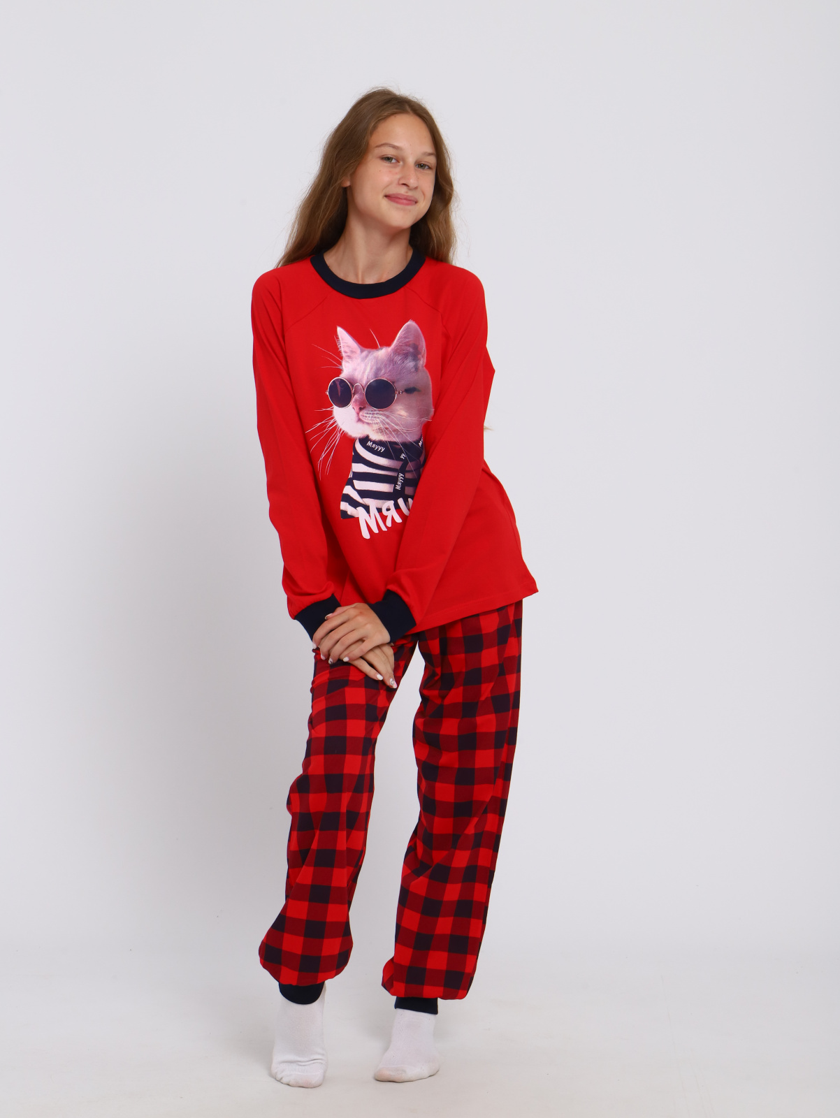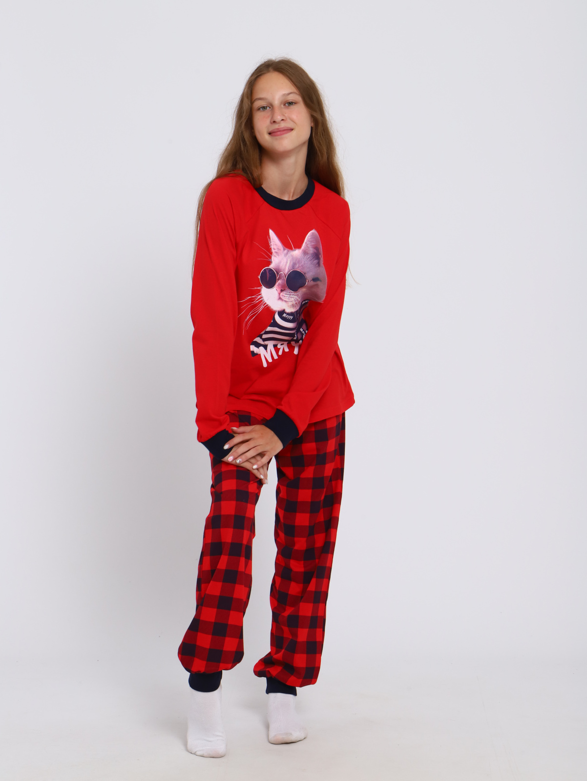 Пижама для Ваших любимых деток школьного и подросткового возраста с модным принтом. Комплект для дома состоит из кофты с длинным рукавом и штанишек, выполнен из мягкой качественной хлопковой ткани. На лонгсливе модный рисунок "котик в очках", брюки из трендовой клетчатой ткани. Костюм пошит в свободном полуприлегающем стиле, без карманов, для полного комфорта ребенка во сне. Штаны в талии легко регулируются при помощи эластичной резинки. Манжеты на рукавах и штанах придают дополнительное удобство при носке. Яркий и модный дизайн пижамы порадует и детей, и взрослых. Каждый найдет себе пижаму по душе. Один и тот же комплект подходит как для девочек, так и для мальчиков. Пижама отлично подойдет для сна и для повседневной носки в любое время года. А качество ткани, принта и пошива пижамы будет радовать своим первоначальным видом несколько сезонов.Теги: пижама для девочки,пижама для мальчика,пижама детская,пижама трикотажная,пижама детская для мальчика,пижама для дома,пижама с принтом,пижама для сна.