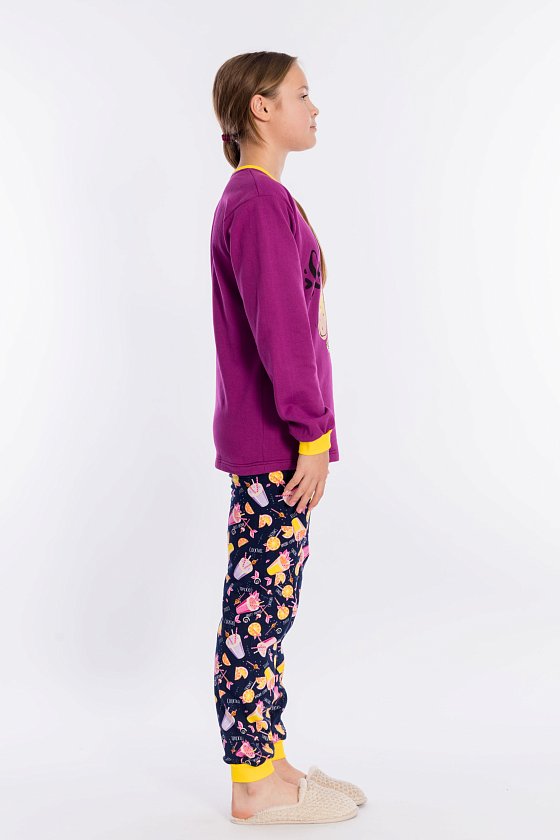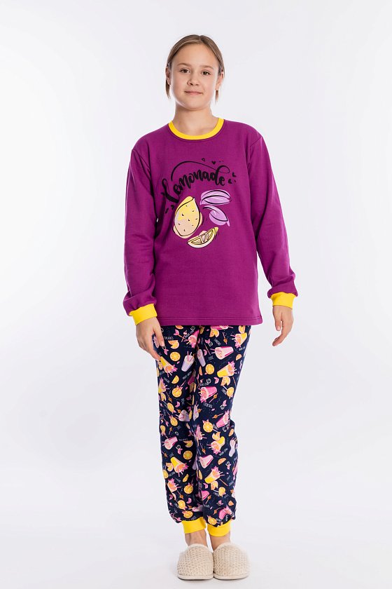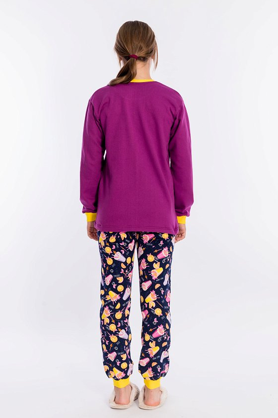 Пижама выполнена из футера с начёсом. Состоит из брюк и толстовки с длинным рукавом. Спереди на толстовке расположен красивый принт. Брюки с поясом на резинке.