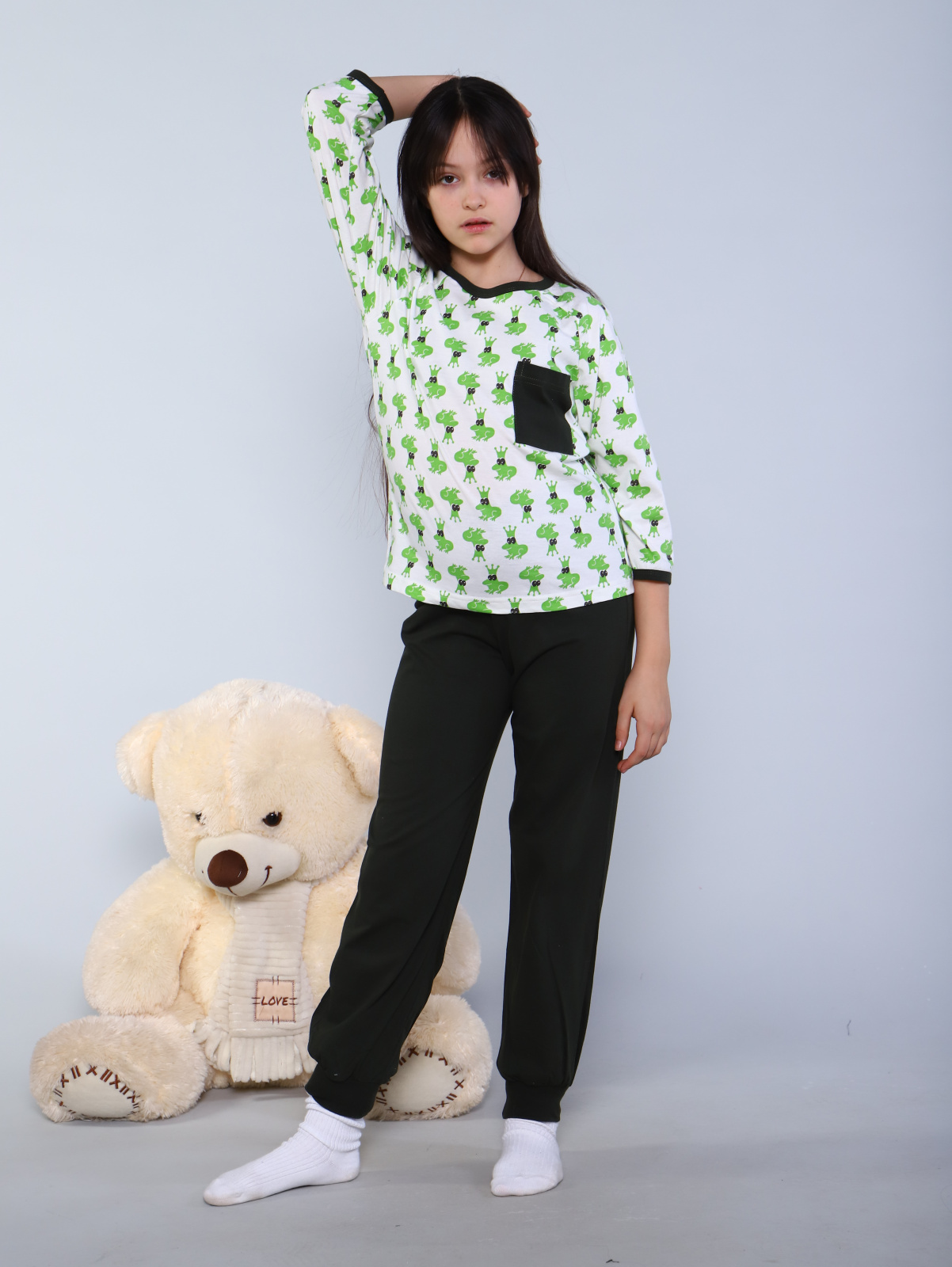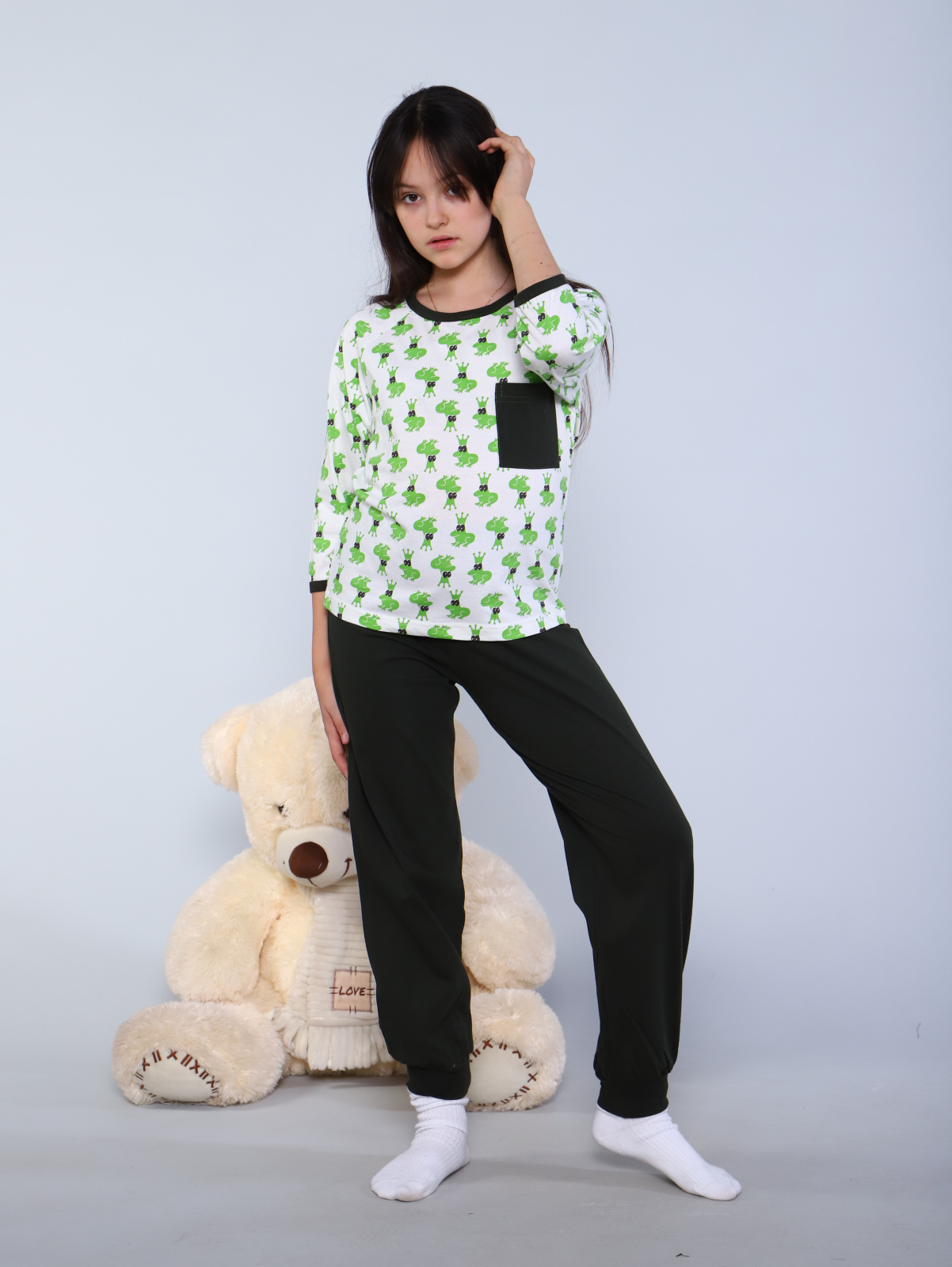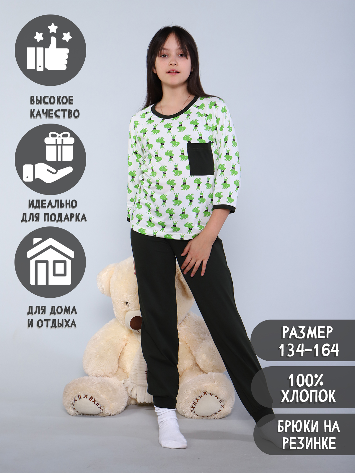 Подростковый костюм с брюками сшит из трикотажа с нежным рисунком, хлопком, приятный к телу. Детская кофта с рукавами три четверти, с кармашком. Однотонные брюки с поясом на резинке и манжетами снизу.