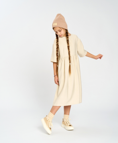 Оверсайз платье с коротким рукавом для девочки смотрится романтично и воздушно. Сделано из вискозного лиоцелла, который отличается прочностью, мягкостью и воздухопроницаемостью. Детское платье свободное, с рукавами до локтя и завышенной талией – максимально комфортное, идеальное для активных детей. Чтобы модель было удобно надевать и снимать, сзади есть пуговка. Длина миди позволит носить сарафан на каждый день, надевать на праздники и любой другой повод. Изделие однотонное, светлое, оттенка песчаный берег, поэтому его будет легко комбинировать с одеждой и аксессуарами разных цветов. Для практичности в шве есть два кармана.