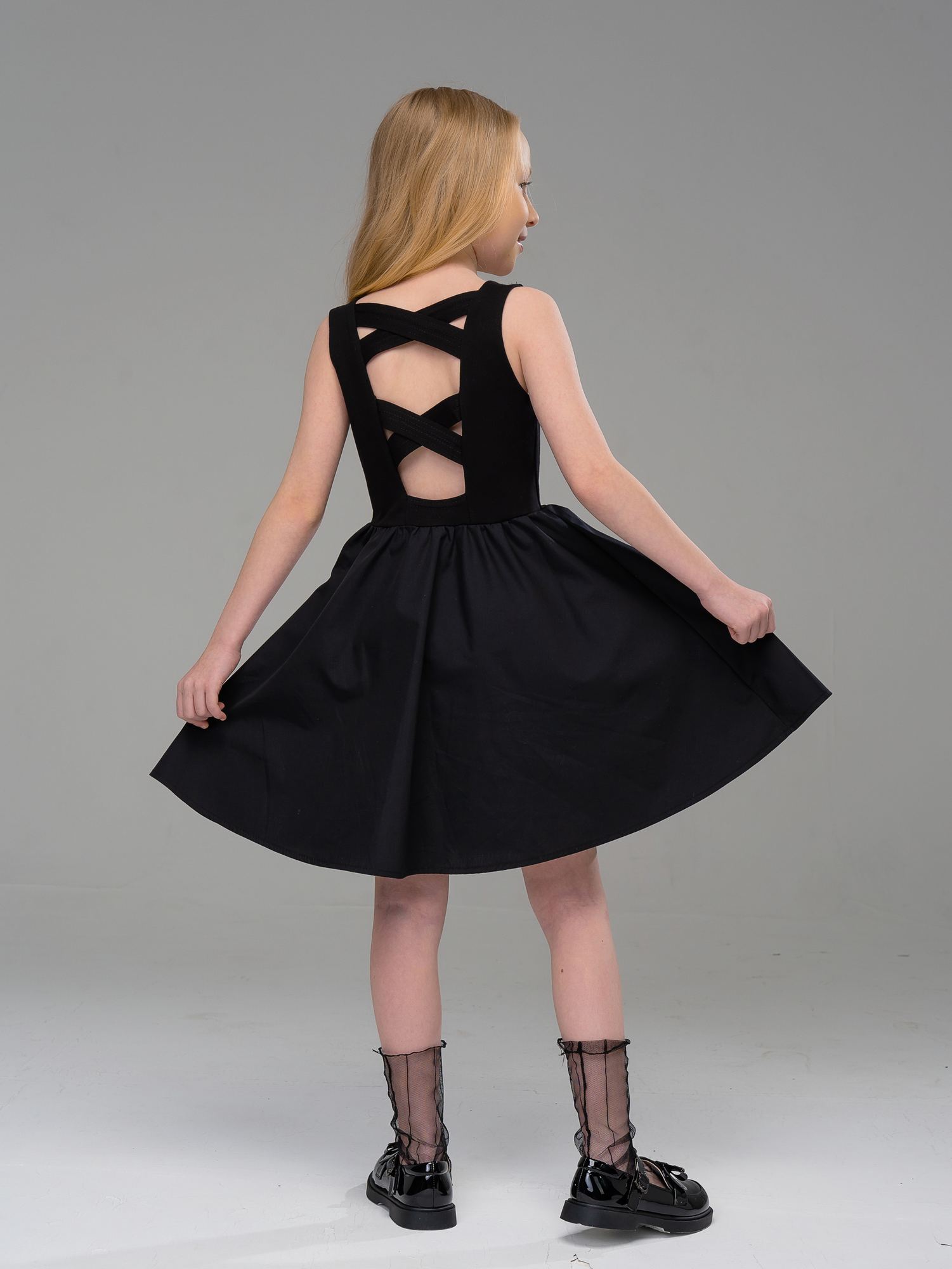 Стильное летнее платье-срафан с открытой спинкой, без рукавов из кулирки черного цвета для девочки, отрезное по линии талии. Юбка расклешенная, со сборками. Изделие выполнено из трикотажа премиального качества - ПЕНЬЕ, с содержанием хлопка более 95%