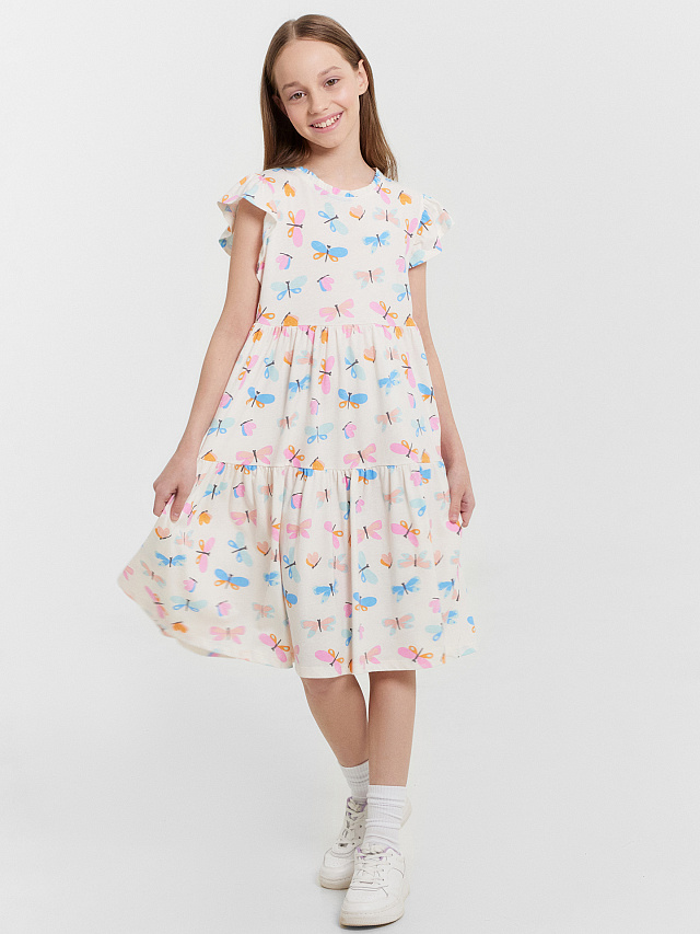 Платье А-силуэта. Короткие рукава-крылышки. В круглую горловину втачана декоративная рюша. По спинке застежка на пуговицу. Платье с двумя отрезными воланами по переду и спинке. Низ изделия обработан швом в подгибку на 2-х игольной плоскошовной машине.