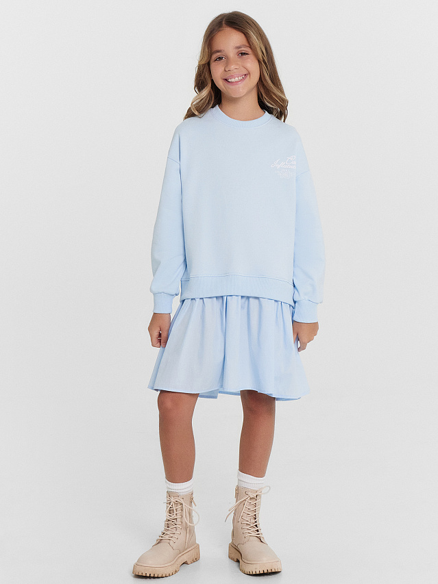Это стильное платье для девочек свободного силуэта сочетает в себе комфорт и элегантность. Горловина круглой формы придает платью классический вид, а сборка из поплина на нижней части добавляют оригинальности и очарования. Длинные рукава с эластичными манжетами из рибаны и спущенная линия плеча подчеркивают современный и расслабленный стиль, делая это платье идеальным выбором для различных мероприятий и повседневного ношения. Оно станет замечательным дополнением гардероба каждой девочки, сочетая в себе уют и изысканность.