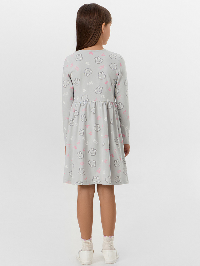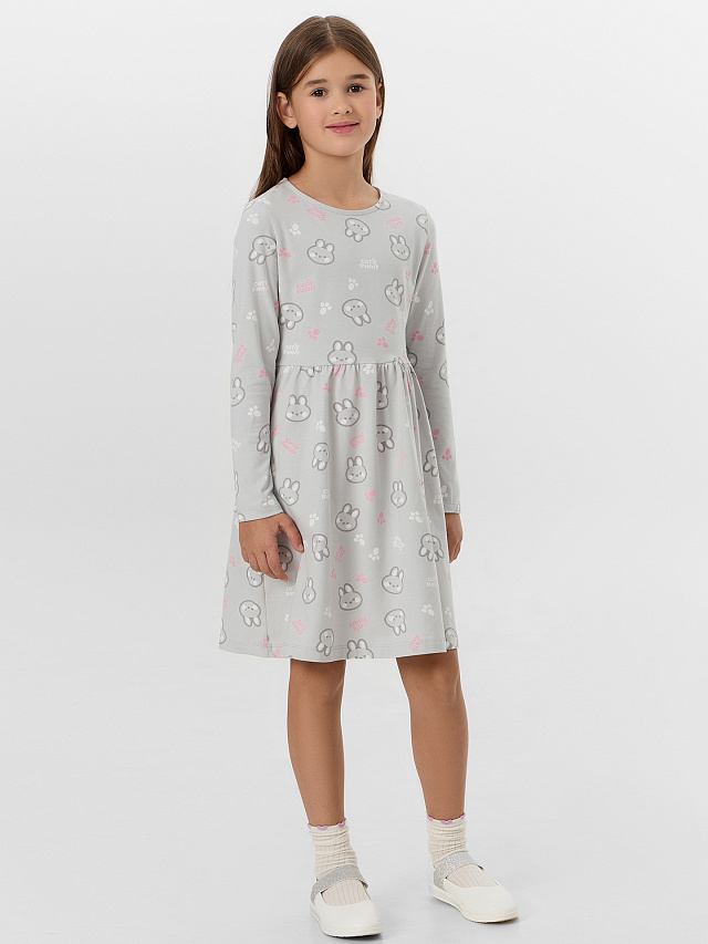 Серое платье для девочек с очаровательным узором кроликов и надписью «Милый кролик» станет прекрасным нарядом для праздника. Модель с отрезной юбкой, собранной по линии талии в нежные складки, создает воздушный и нарядный силуэт.