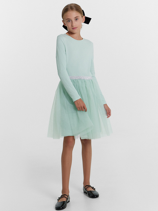 Очаровательное платье для девочек от Mark Formelle. Модель полуприлегающего силуэта с отрезной фатиновой юбкой. Длина выше колена. Горловина круглая. Рукав длинный. Юбка трехслойная на сборке, верхние два слоя из сеточки, подкладка из трикотажного кулирного полотна. Блестящий пояс из жаккардовой тесьмы. Ваша маленькая принцесса будет сиять в этом волшебном платье на любом мероприятии! Свободный крой позволит ей легко двигаться и наслаждаться каждым мгновением, а разнообразие размеров и цветов даст возможность выбрать идеальный вариант, который подчеркнет ее неповторимый стиль. Рекомендуем!