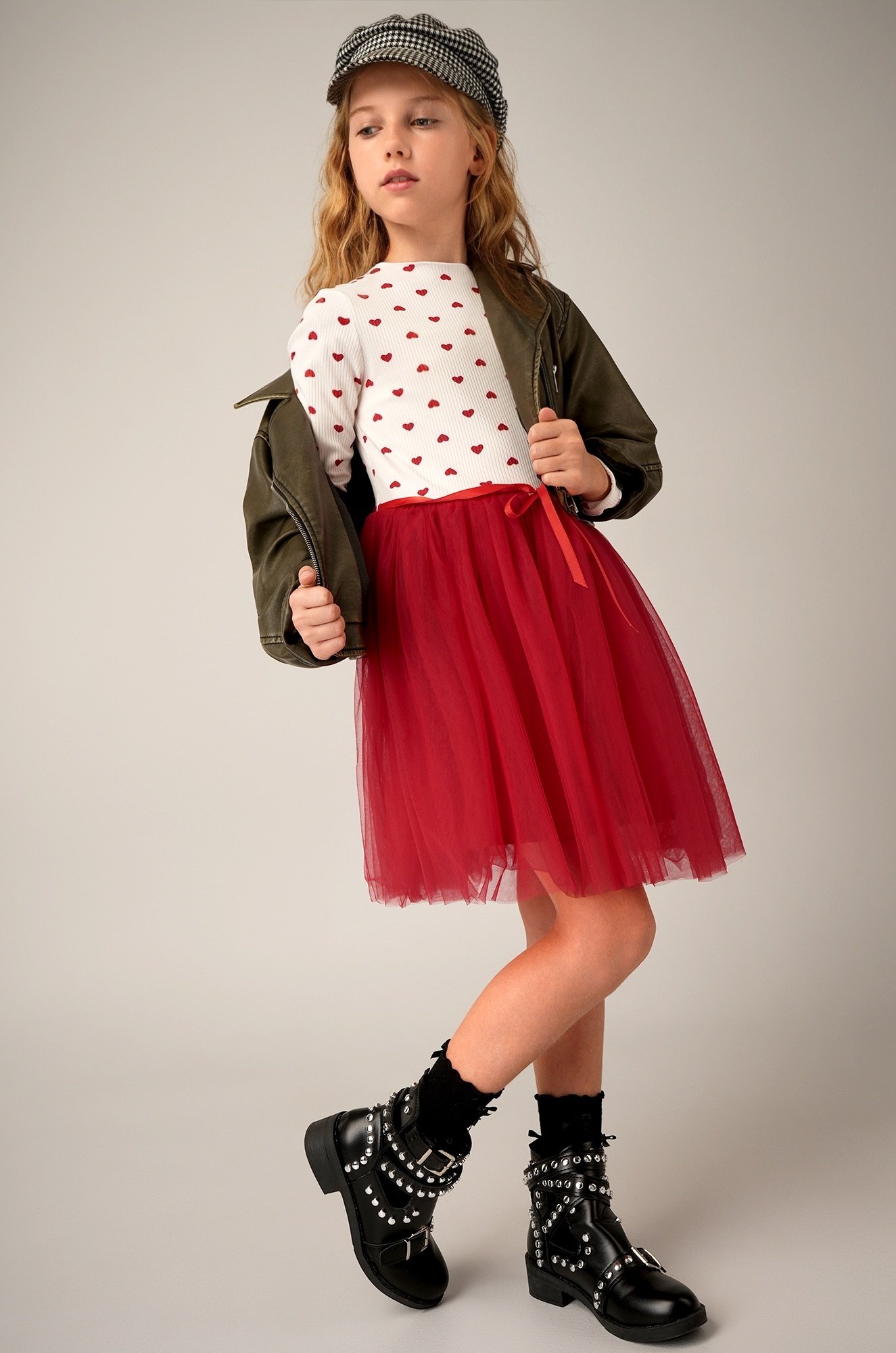 Длинные рукава и горловина с волнистыми краями придают изысканность и нежность. Пышная юбка с акцентным поясом делает образ завершенным, даря маленькой леди шарм и обаяние, которые невозможно не заметить. Принт сердечки на фактурной ткани лапша добавляет трогательной романтики.