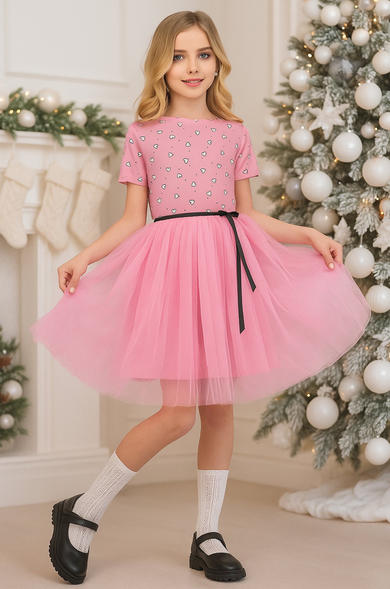 Короткое платье в рубчик станет незаменимым компаньоном для торжественных мероприятий. Розовое платье с сердечками поможет создать волшебный образ. Пышное платье длины мини выполнено из мягкой хлопковой ткани с добавлением полиэстера и эластана, что делает его эластичным и комфортным. Юбка из фатина и подкладка из 100% хлопка дарят легкость и невесомость.