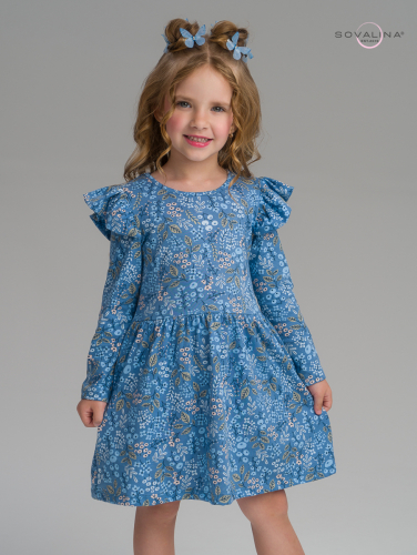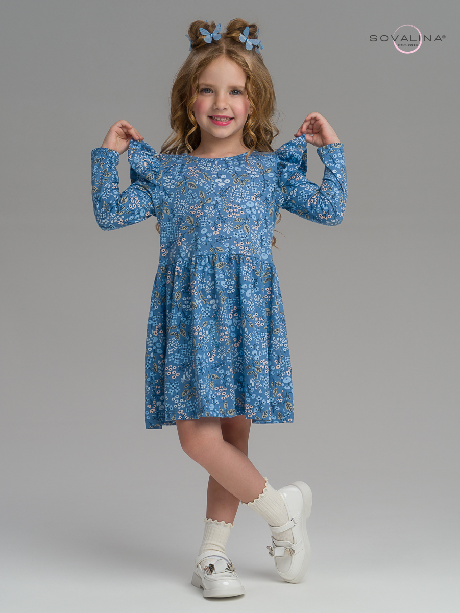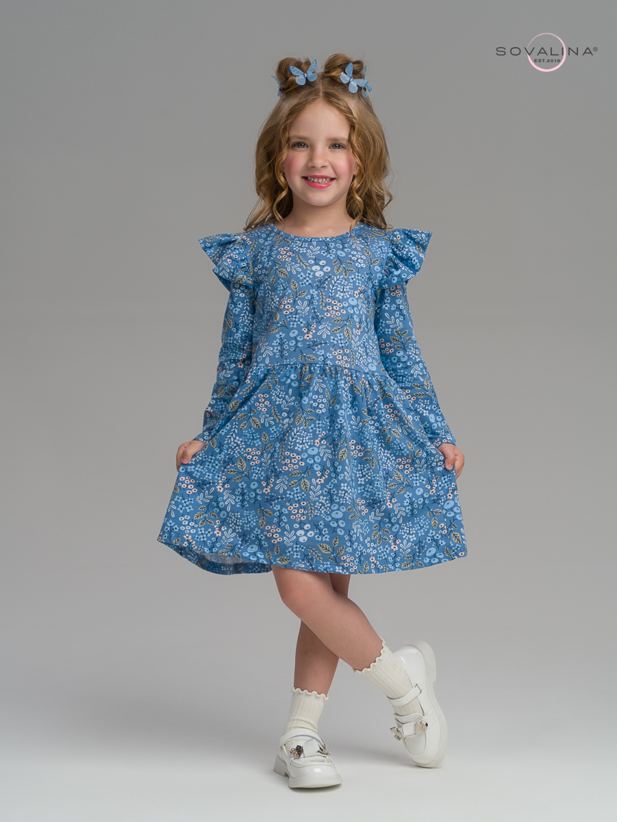 На плечах имеется легкое крылышко, которое добавляет платью оригинальности и дополняет образ маленькой модницы. Такой наряд подойдет как на праздник, так и на повседневную носку.