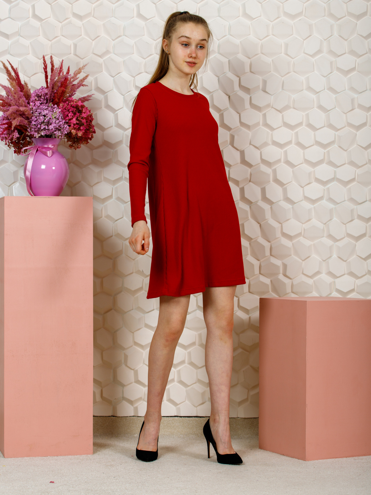 Подростковое платье прямого силуэта, с круглым вырезом, длинными рукавами.