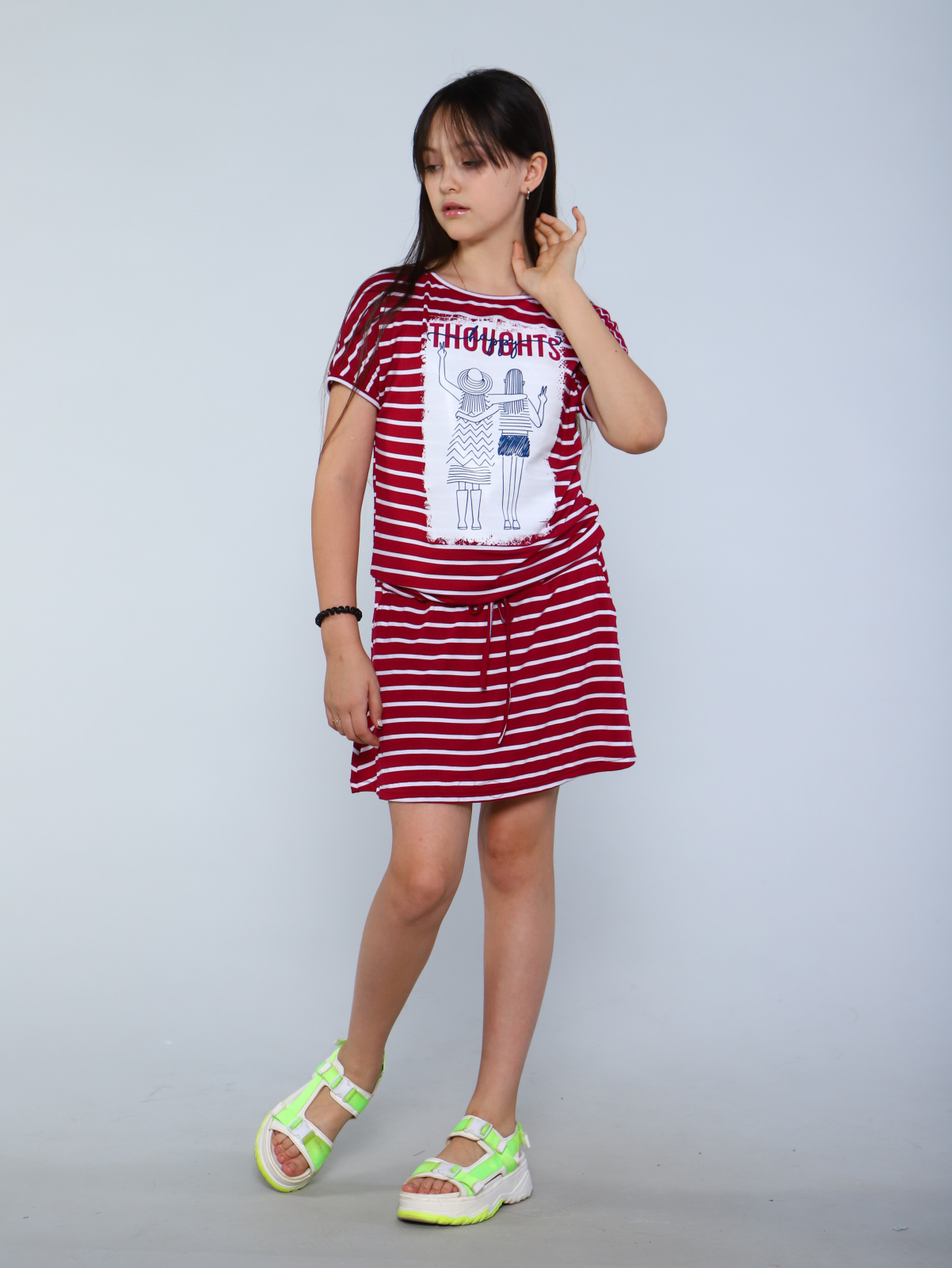 Платье в полоску для девочек с короткими рукавами, по бокам кармашки. Детский сарафан прямого кроя по фигуре до бедер, длина и ширина фиксируется кулиской, далее расклешонная юбка  мини выше колена.