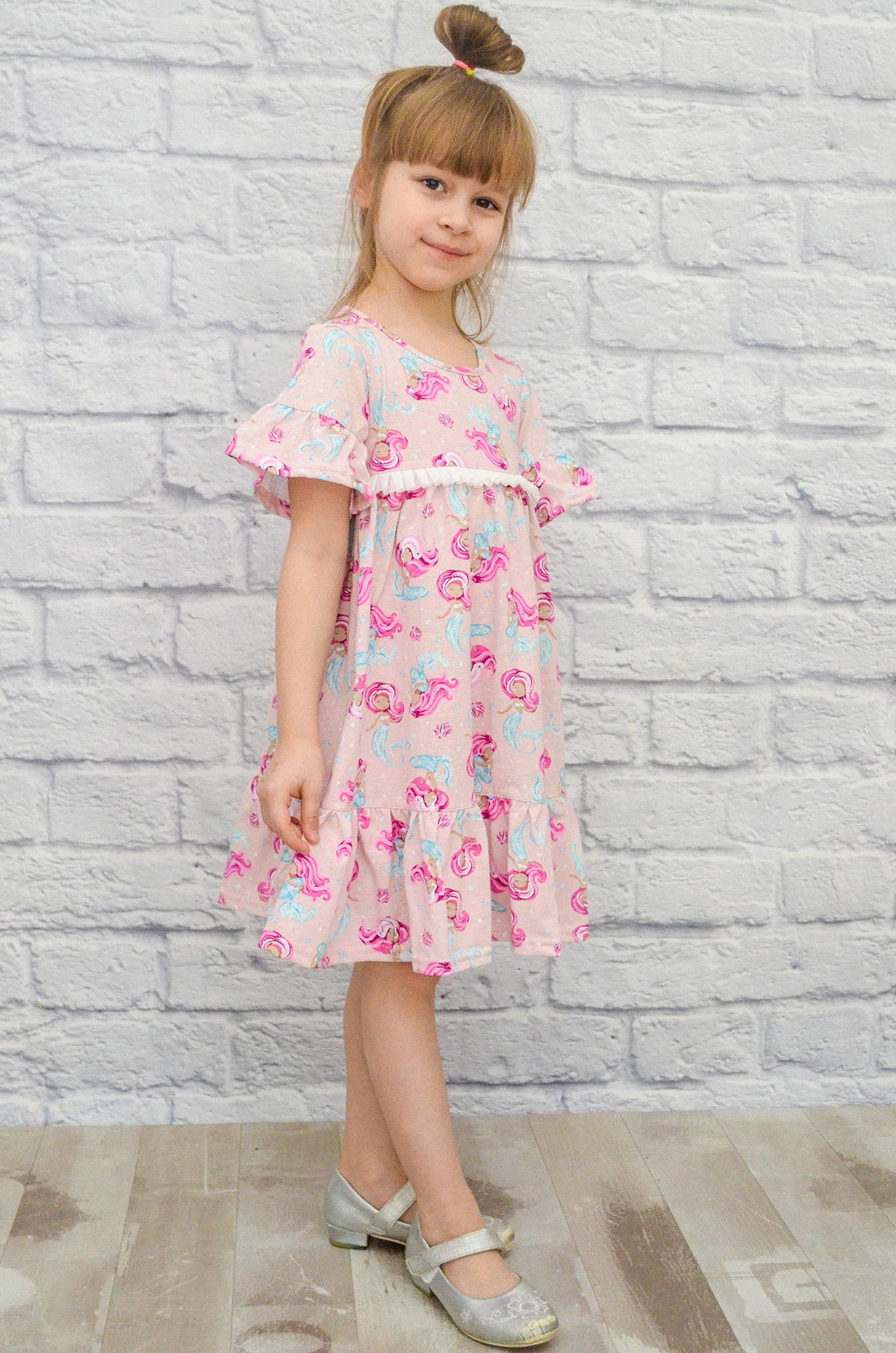Очень симпатичное хлопковое платье для маленьких принцесс. Модель с отрезной кокеткой, линия талии завышенная, рукав "колокольчик", по низу пришита пышная оборка.