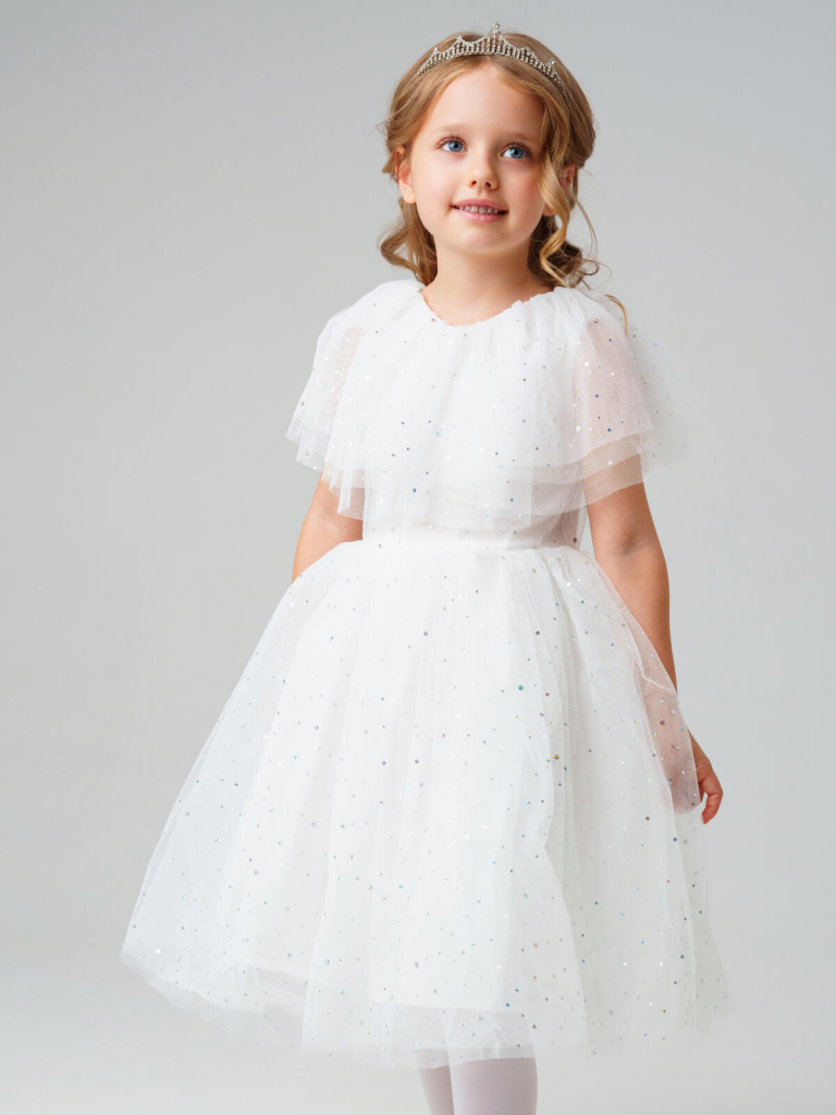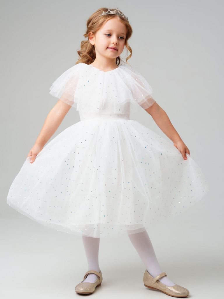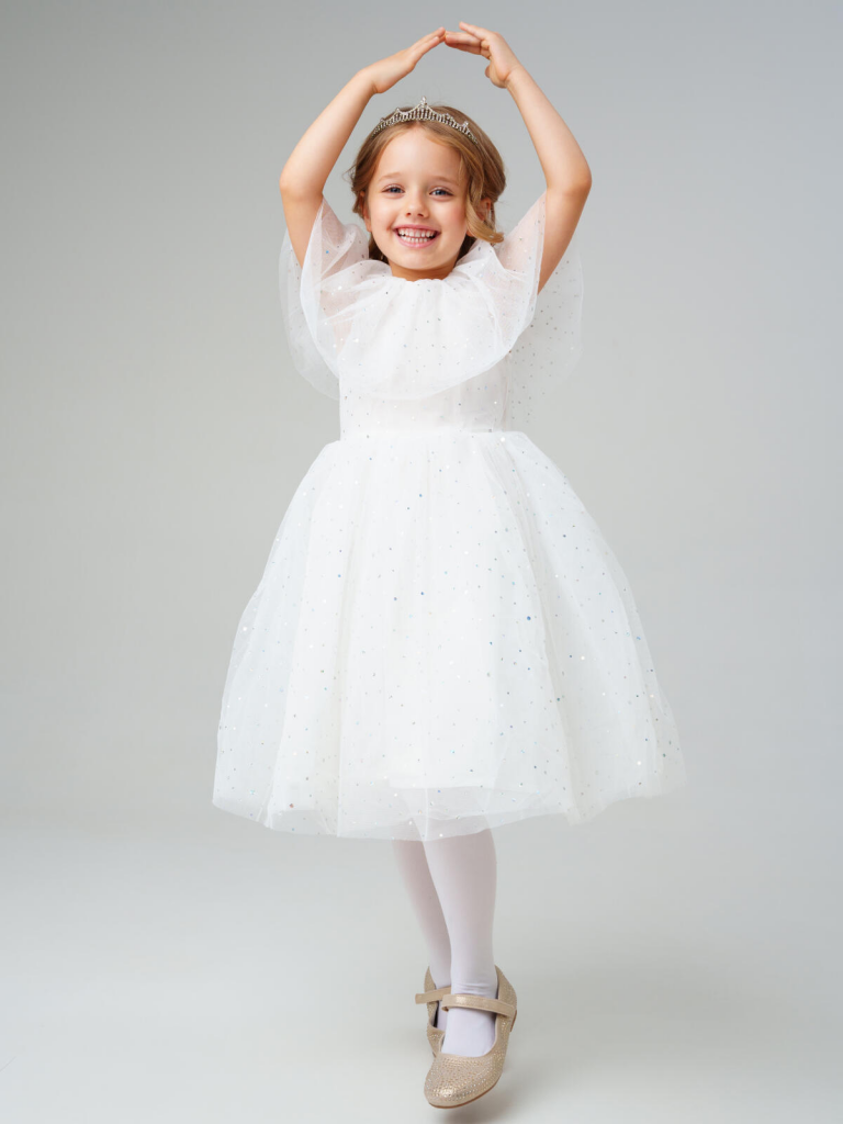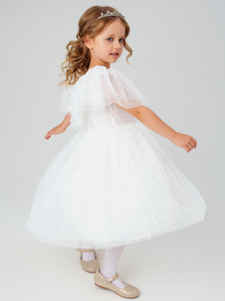 Нарядное белое детское платье для девочки от PlayToday — нежная и воздушная модель, созданная для особых случаев. Лёгкая сетчатая ткань с мерцающими блёстками делает платье праздничным и волшебным, а мягкая хлопковая подкладка обеспечивает комфорт даже при длительном ношении.Преимущества модели:+ верх из полупрозрачной сетки с блестящим напылением — эффект звёздного сияния+ мягкая подкладка из хлопкового поплина — приятна к телу, обеспечивает комфорт и воздухопроницаемость+ пышная юбка из нескольких слоёв фатина создаёт объём и лёгкость силуэта+ короткие рукава и аккуратный вырез — комфортная посадка без лишних деталей+ лёгкий вес и мягкий материал — ребёнку удобно двигаться и игратьКогда и как носить:Идеально подойдёт для праздников, утренников, фотосессий, дней рождения, Нового года и торжественных мероприятий. Можно дополнить аксессуарами для создания образа маленькой принцессы.Советы по стилю:Сочетайте с белыми или серебристыми балетками, туфельками или босоножками от PlayToday. Для завершения образа добавьте тонкий ободок или корону, а в прохладную погоду — лёгкий кардиган.Размерный ряд: 98-122 см.Белое детское платье PlayToday — воплощение лёгкости, блеска и сказочного настроения для особенных моментов. Верхняя ткань: 100% полиэстерПодкладка: 60% хлопок, 40% полиэстер