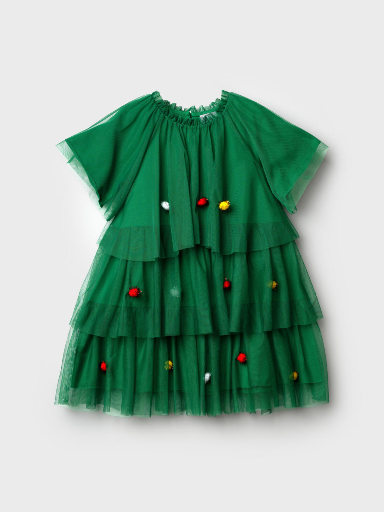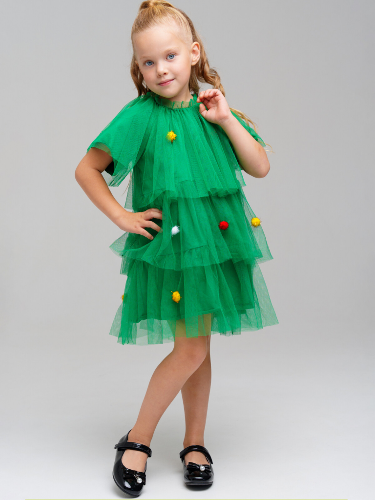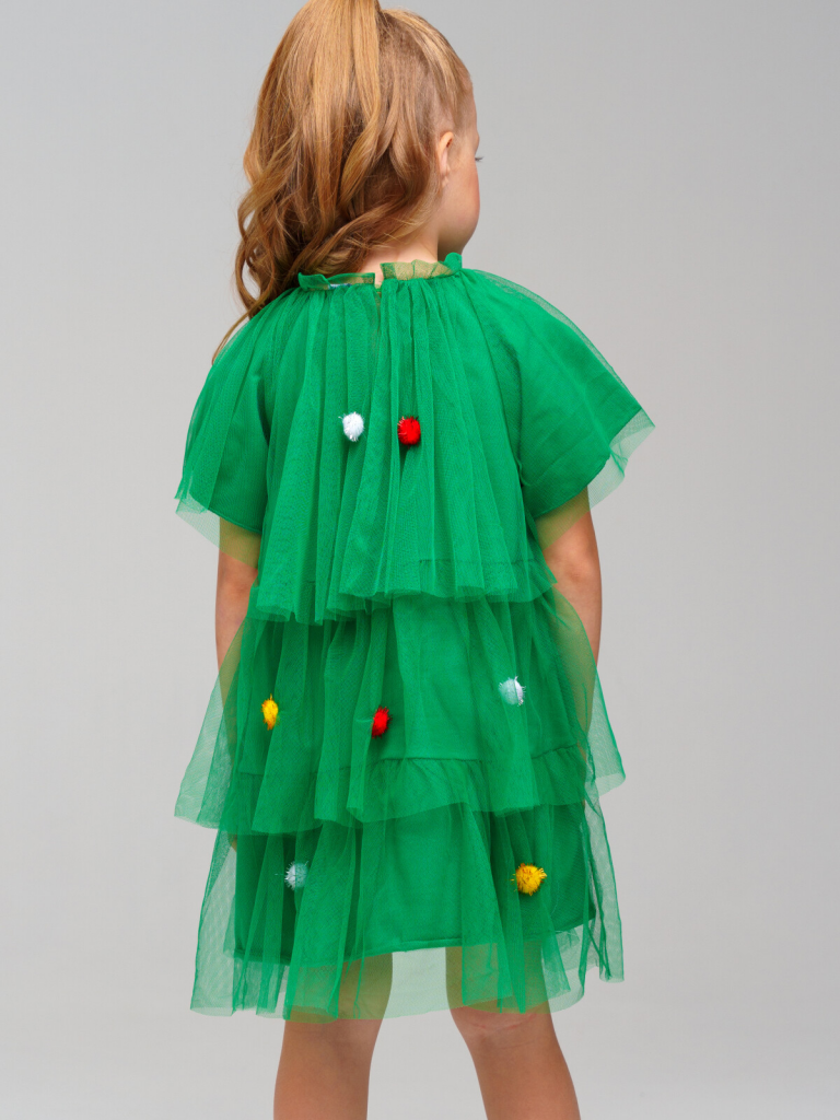 Платье карнавальное - ёлочка. Подкладка из трикотажа с высоким содержанием хлопка 95%. Благодаря наличию эластана в составе ткани, изделие держит форму и меньше мнется. Без застежек. Сверху мягкая сетка, декорированная разноцветными помпонами.