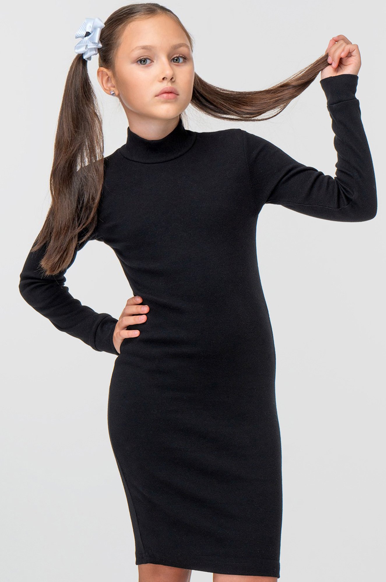 Очарование в простоте! Детское платье-водолазка для девочек и девочек-подростков выполнено из плотной трикотажной ткани кашкорсе. Облегающий силуэт, длинный рукав на манжете и воротник стойка – каждая деталь делает платье для детей элегантным.