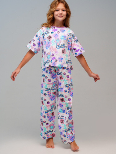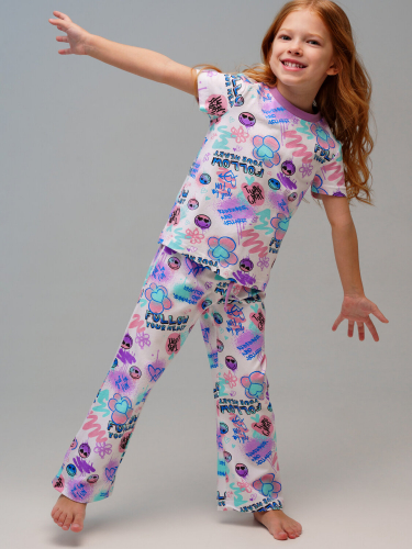 Пижама детская для девочки. Футболка и брюки из эластичного и приятного на ощупь трикотажа. Штаны на резинке со шнурком. Трикотажные манжеты. Высокое содержание хлопка 95%. Благодаря наличию эластана в составе ткани изделие держит форму и меньше мнется.