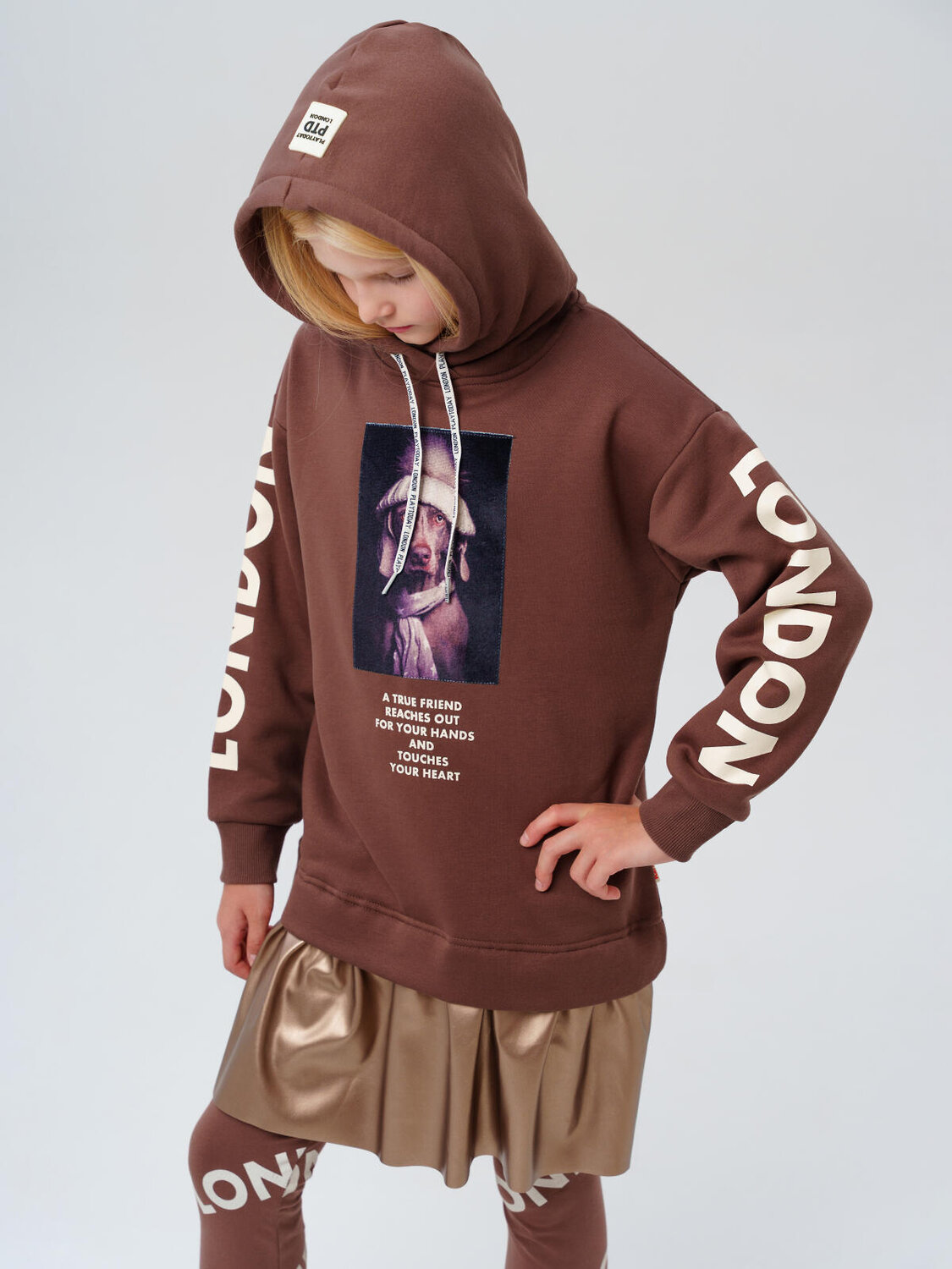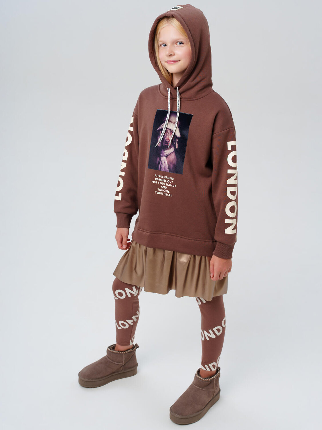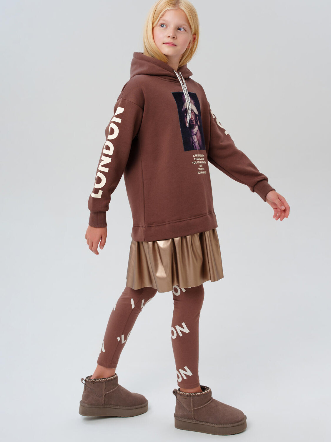 Модель выполнена из мягкого трикотажного полотна, обеспечивающего комфорт и свободу движений в течение дня. Удлинённый крой в стиле худи, трендовый принт на велюре, надписи по рукавам и кожаная декоративная вставка делают это платье не просто одеждой, а полноценной модной деталью гардероба подростка.