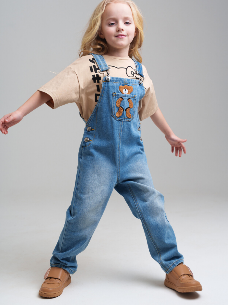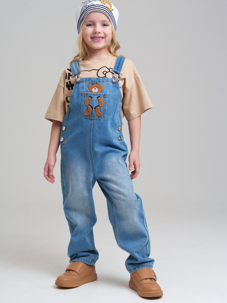 Детский джинсовый комбинезон для девочки. Джинсовый комбинезон-ромпер из эластичного денима. Посадка comfort fit - свободный крой. Регулируемые по длине лямки. Застежка на кнопки по бокам модели. Функциональные карманы. Декор - мишка. Модель выполнена из качественного и плотного текстиля.