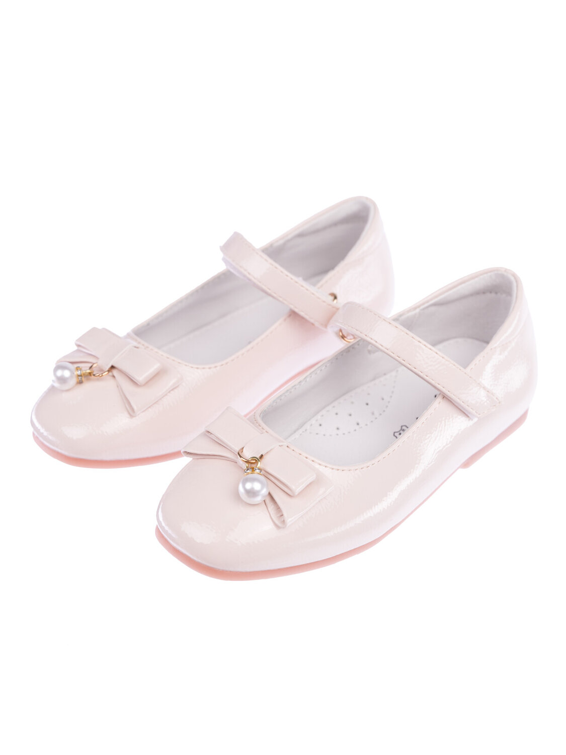 Нарядные туфли на невысоком каблучке украшены бантиком с искусственной жемчужиной. Подкладка выполнена из натуральной кожи. Стелька выполнена из натуральной кожи и имеет анатомический элемент для поддержания свода стопы. Удобная колодка. Подошва из терморезины очень гибкая. Для удобства обувания предусмотрена возвратный ремешок с липучкой. В пяточной части для комфорта предусмотрен мягкий кант.