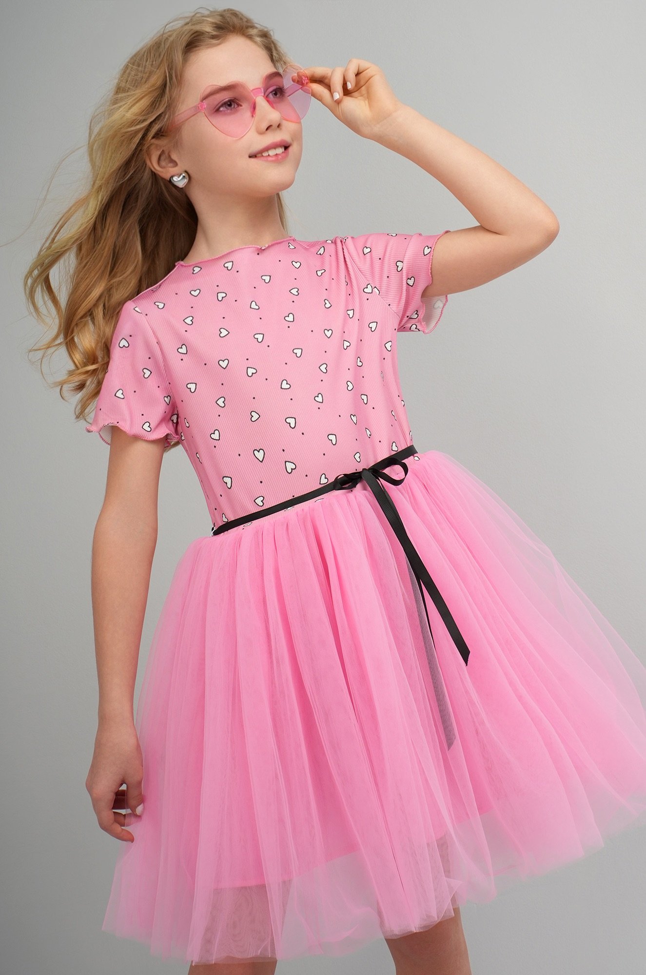 Короткое платье в рубчик станет незаменимым компаньоном для торжественных мероприятий. Розовое платье с сердечками поможет создать волшебный образ. Пышное платье длины мини выполнено из мягкой хлопковой ткани с добавлением полиэстера и эластана, что делает его эластичным и комфортным. Юбка из фатина и подкладка из 100% хлопка дарят легкость и невесомость.