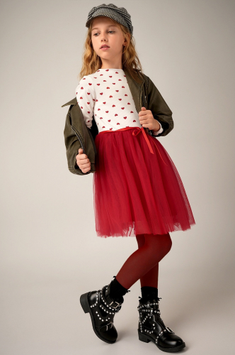 Трикотажное платье длины мини выполнено из мягкой хлопковой ткани с добавлением полиэстера и эластана, что делает его эластичным и комфортным. Юбка из фатина и подкладка из 100% хлопка дарят легкость и невесомость.
