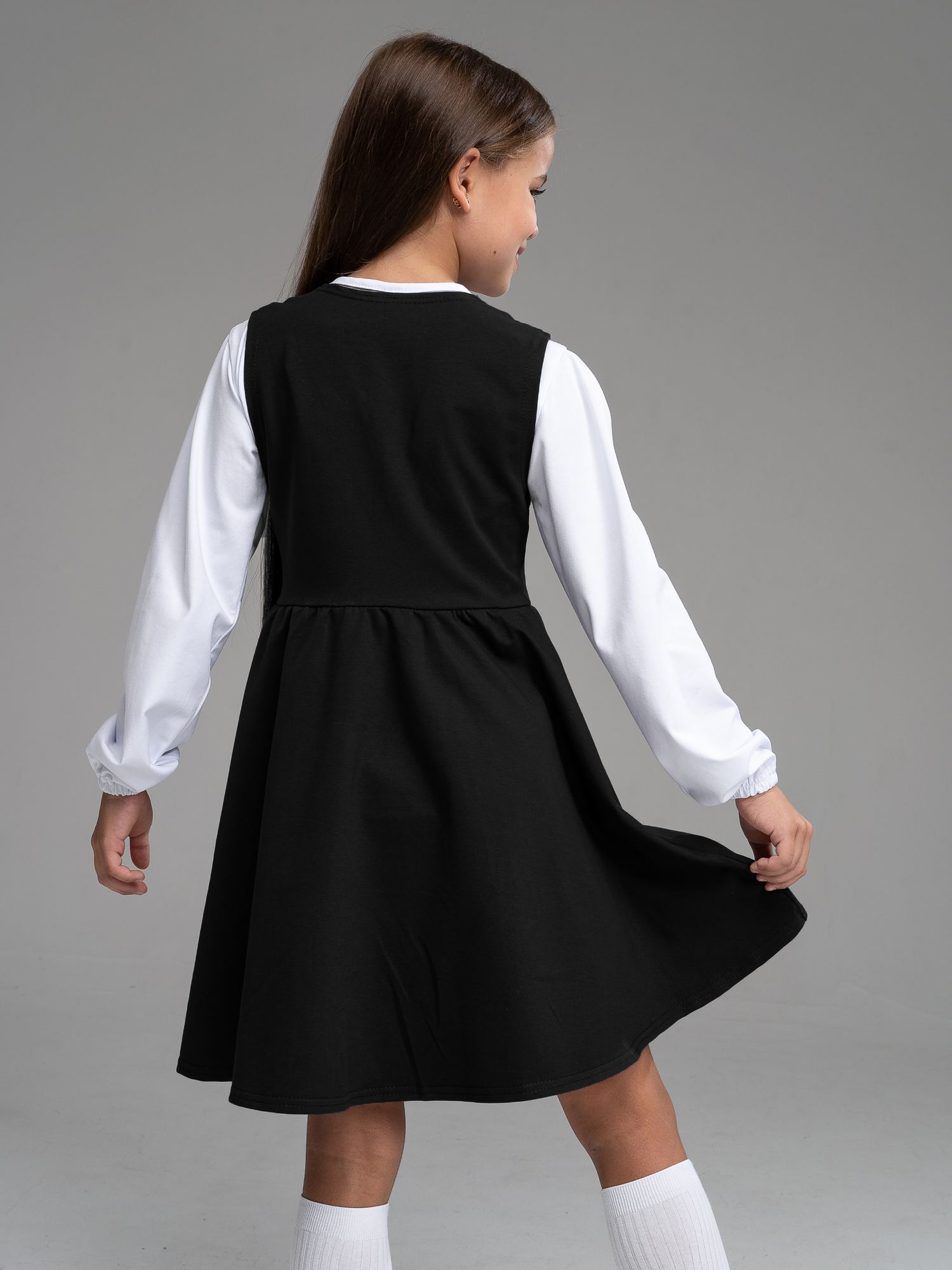 Стильный школьный сарафан из футера черного цвета для девочки, отрезной по линии талии. Юбка расклешенная, со сборками, лиф с имитацией запаха. Изделие выполнено из трикотажа премиального качества - ПЕНЬЕ, с содержанием хлопка более 92%