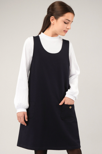 Очередная 5+ в твой дневник – за этот очаровательный сарафан! Детский сарафан для девочек и девочек-подростков выполнен из мягкого футера двухнитки. Комфортный А-силуэт, длина выше колена, аккуратные карманы – этот синий сарафан для детей точно станет любимым элементом школьной формы и покорит сердца окружающих!
