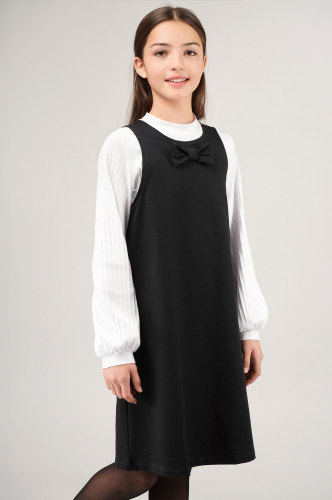 Детский сарафан для девочек и девочек-подростков выполнен из мягкого футера двухнитки. Комфортный силуэт трапеция, длина выше колена, милый бантик – этот черный сарафан для детей точно станет любимым элементом школьной формы и покорит сердца окружающих!