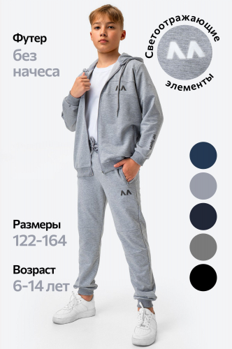 Комфорт в каждом движении! Детский спо..показатьртивный костюм с брюками для мальчиков и девочек выполнен из плотного футера двухнитки. Толстовка с застежкой на молнию, мягкие манжеты и светоотражающие элементы делают серый костюм для детей и подростков стильным и практичным.