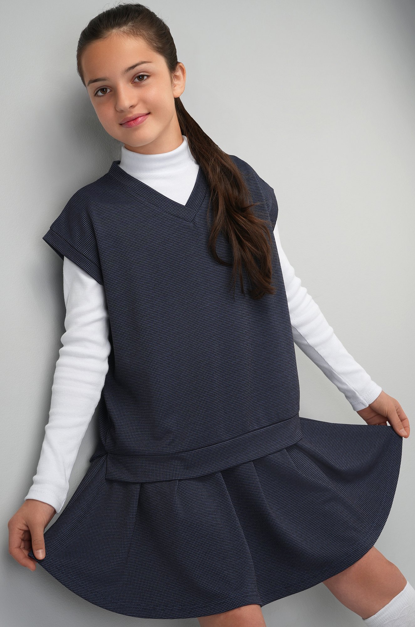 Жилет с V-вырезом и спущенным плечом гармонично сочетается с юбкой до колена, создавая лаконичный и практичный школьный образ. Синий костюм для девочки легко адаптируется под разные случаи — от повседневных уроков до торжественных мероприятий.