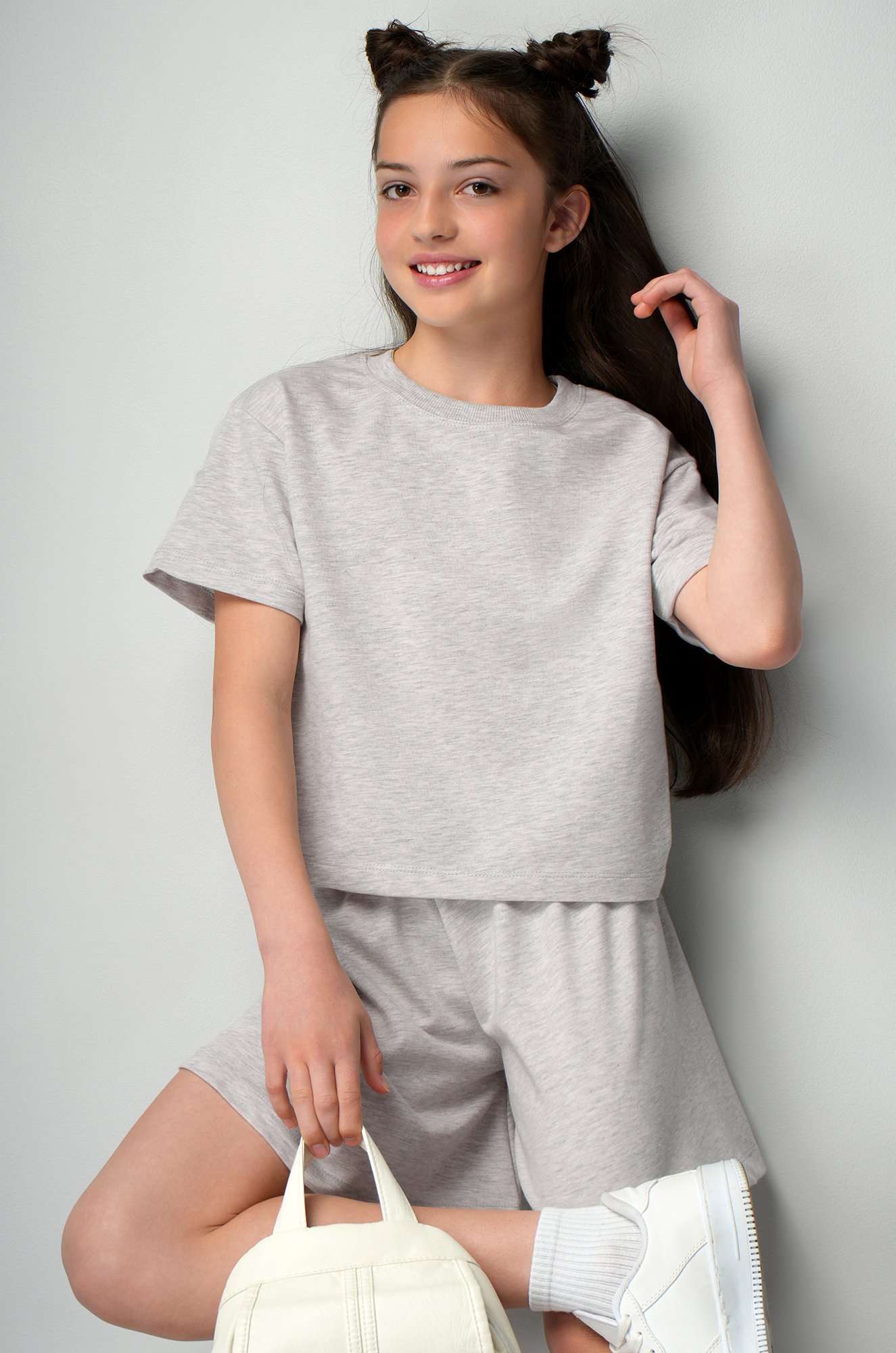 Короткие шорты придают образу игривости и свободы, а свободная однотонная футболка позволит телу дышать. Детский костюм с шортами светло-серого цвета станет отличным выбором для прогулок или путешествий. Домашний хлопковый костюм подойдет на каждый день как хлопковая пижама для сладких снов вашего ребенка.