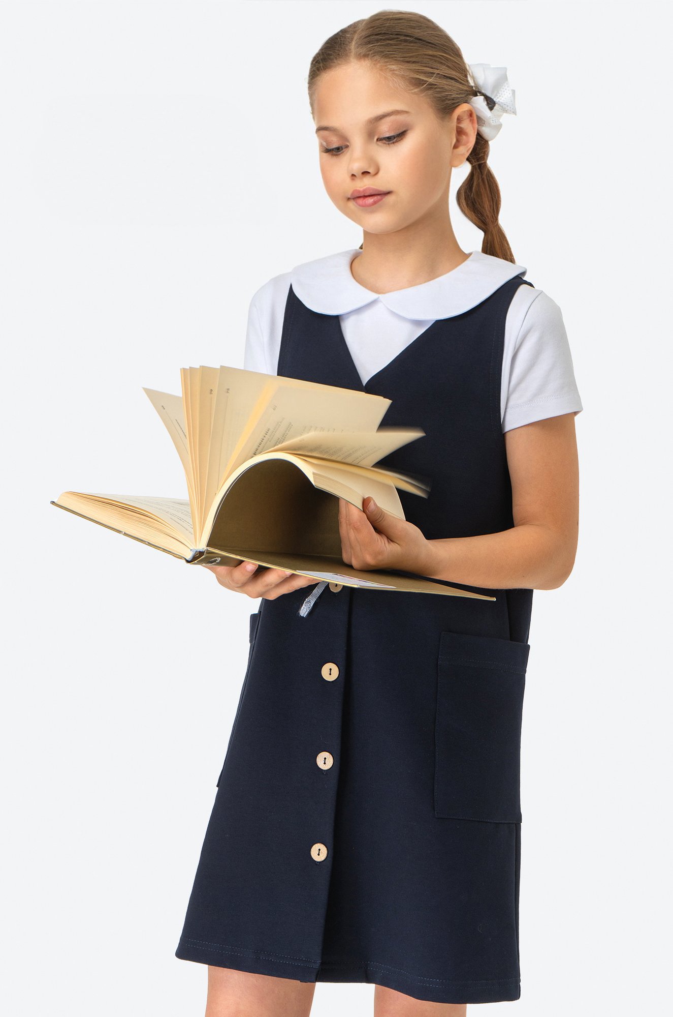Детский сарафан для девочек и девочек-подростков выполнен из мягкого футера двухнитки. Комфортный А-силуэт, длина выше колена, аккуратные карманы – синий сарафан для детей точно станет любимым элементом школьной формы и покорит сердца окружающих!