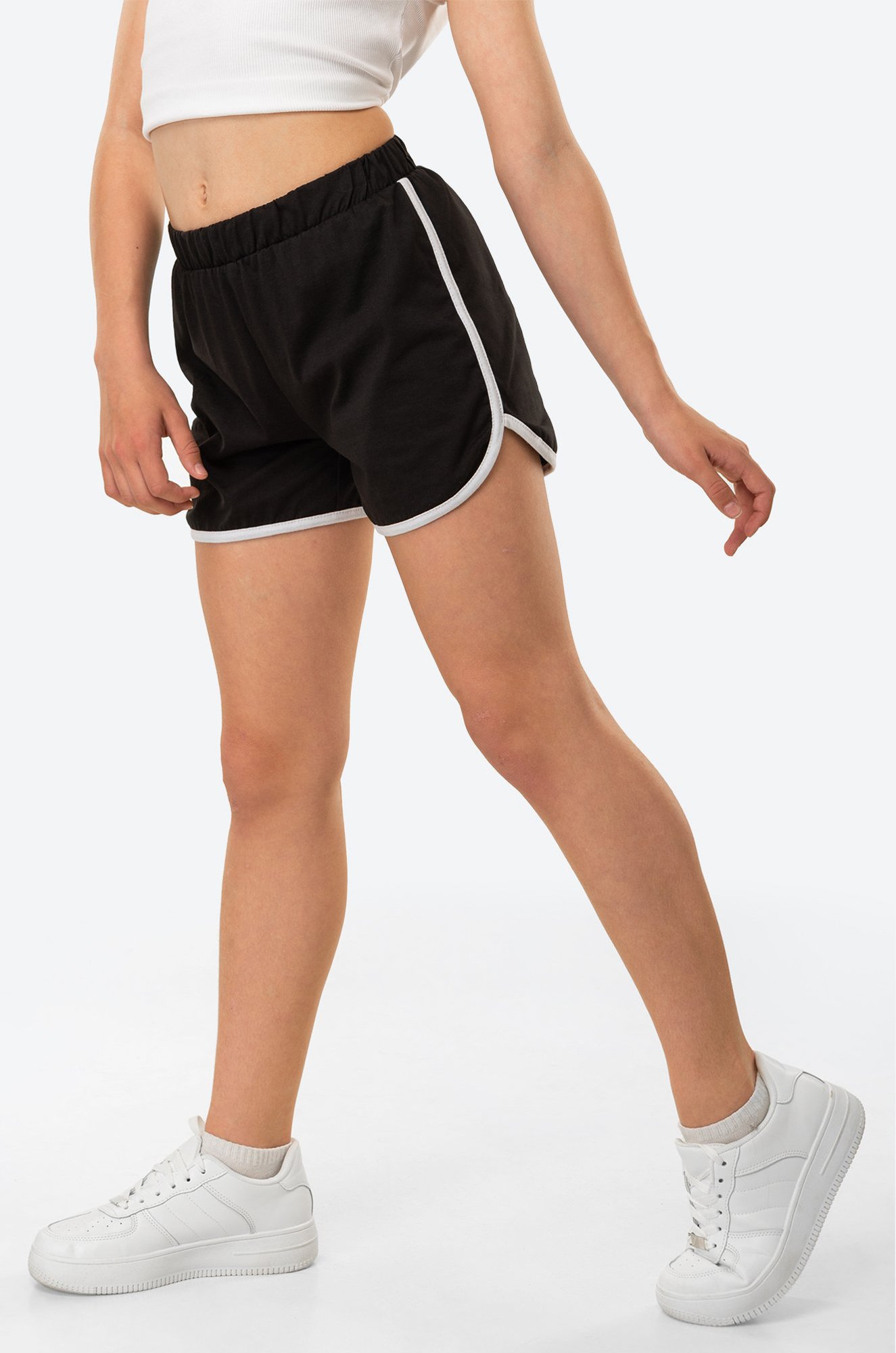 Созданы для активных девчонок! Спортивные шорты для девочки подростка выполнены из 100% хлопка – отличный вариант для летних образов. Стильные шортики представлены в черном цвете и украшены белой окантовкой.