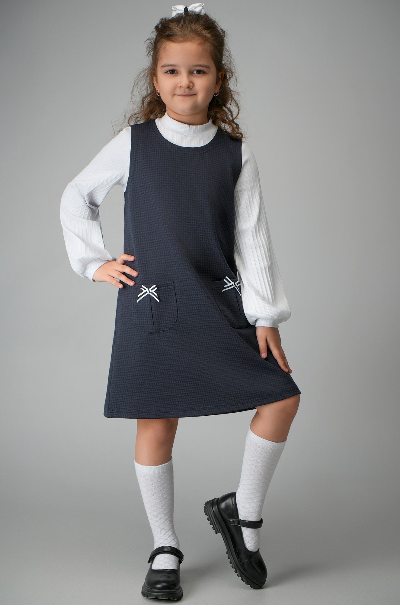 Школьный сарафан для девочки и девочки-подростка сочетает в себе строгость формы и очаровательные детали. Принт гусиная лапка выглядит особенно элегантно, а карманы с бантиками добавляют игривый акцент.