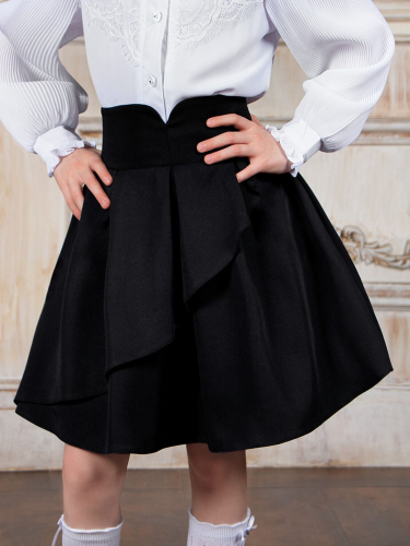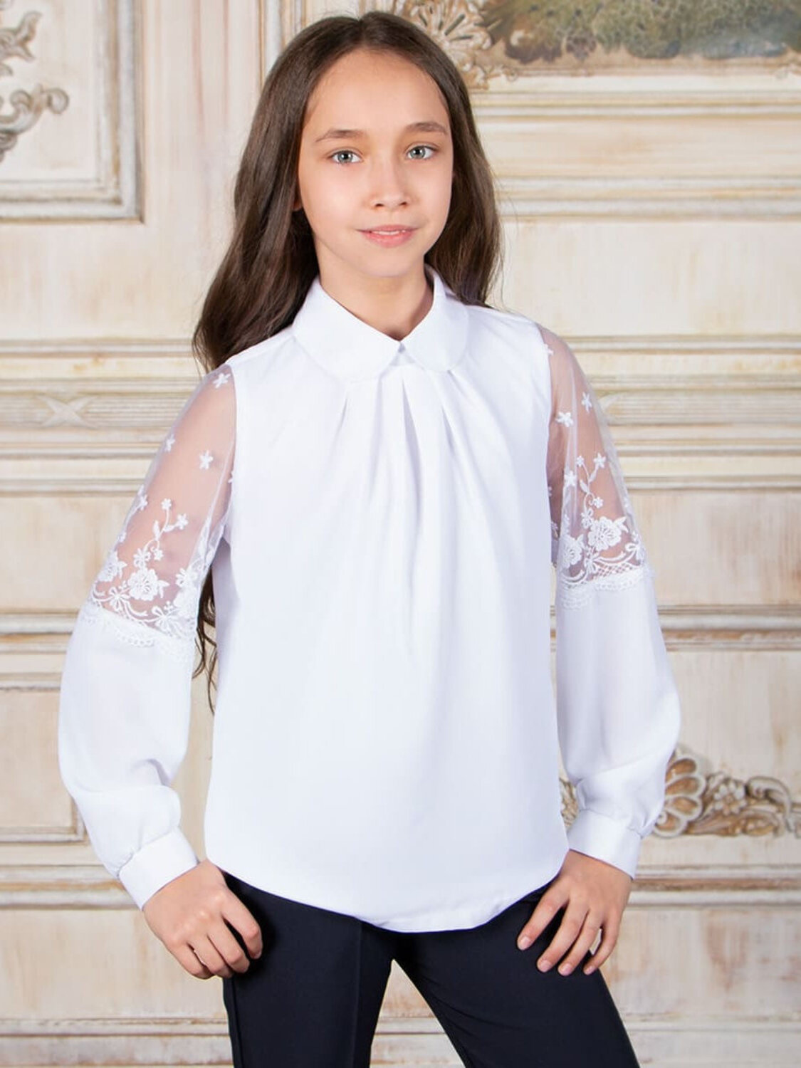 Пышные рукава с манжетами декорированы вставкой из фатина и нежной вышивкой. Блуза имеет дополнительный слой из подкладочной ткани спереди, что делает ее непрозрачной и более комфортной в носке. Ткань-шифон. Прекрасный выбор для школы или торжественного мероприятия.