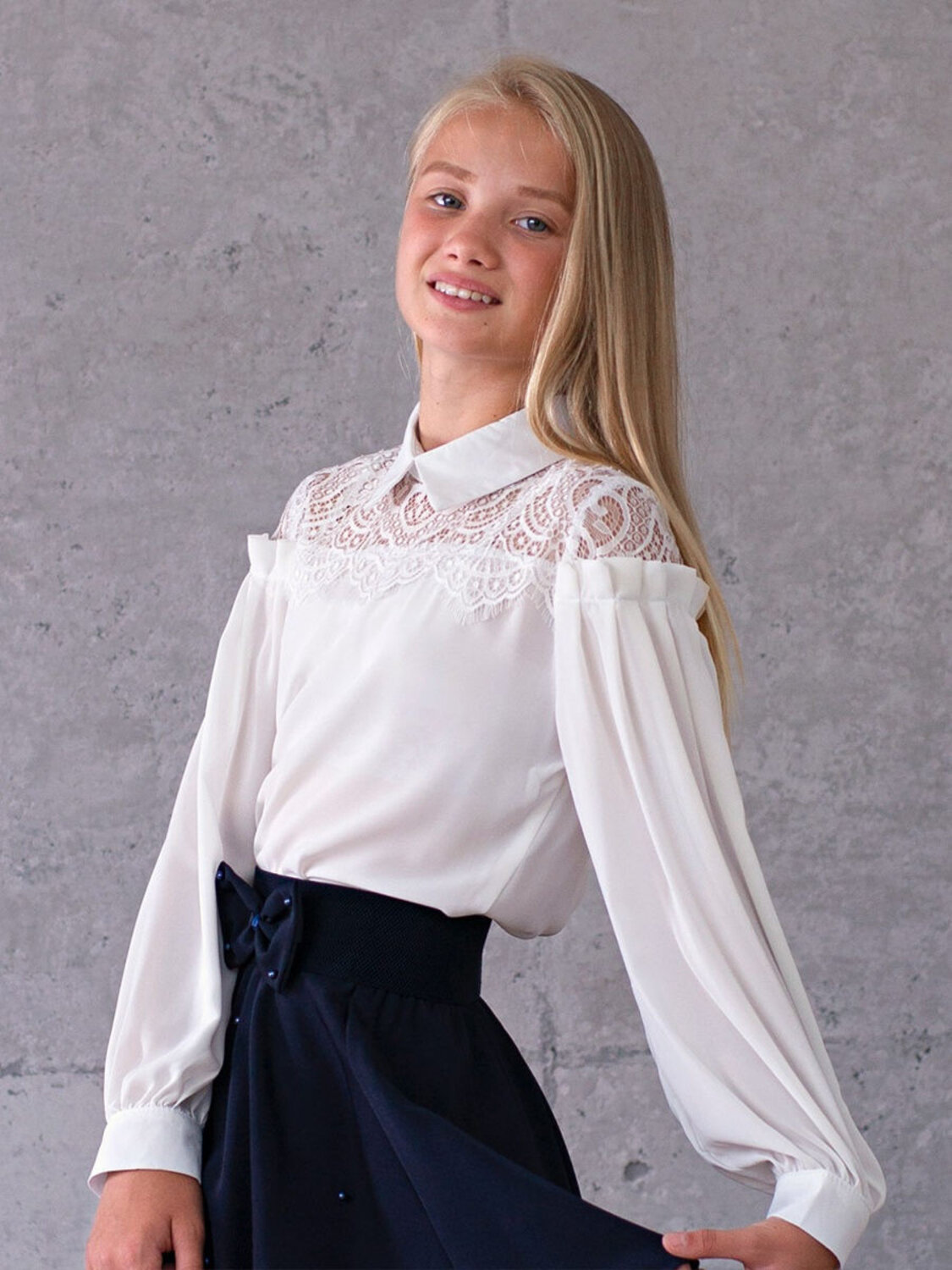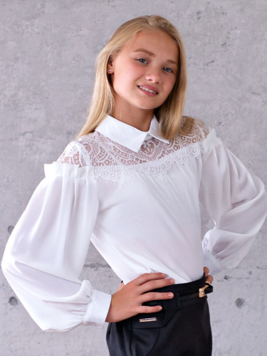 Блузка Соль&Перец длинный рукав. Подростковая блузка, свободного силуэта для девочки. Модель декорирована гипюром, пышные рукава на манжете украшены рюшей. Мягкая, воздушная ткань-шифон хорошо драпируется, не тянется и не мнется, устойчива к разрывам.