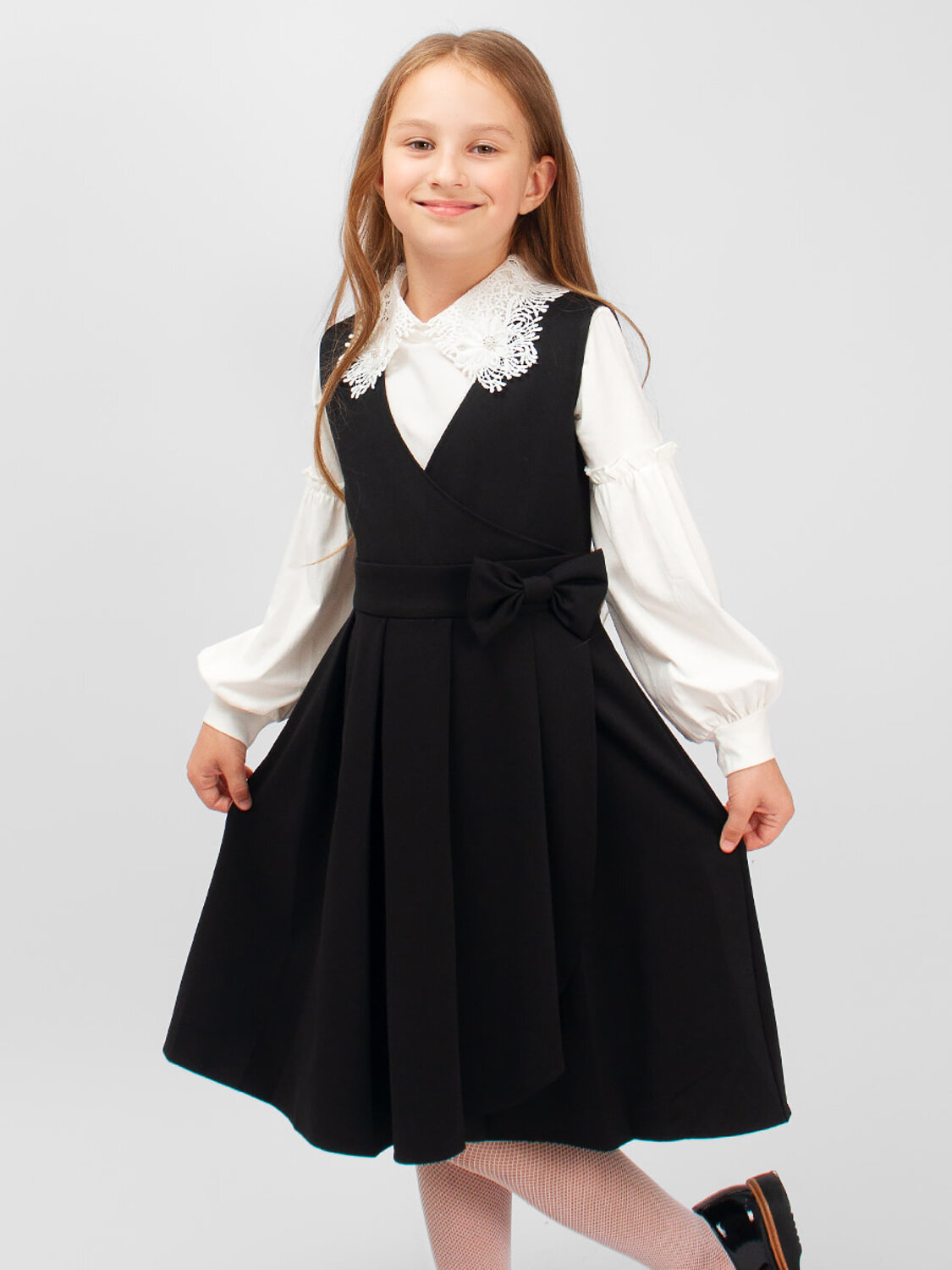 Очаровательный сарафан для девочки Соль&Перец из плотного трикотажа, с подкладом и юбочкой в складку. Сарафан декорирован бантиком из основной ткани. Износоустойчивый материал позволит надолго сохранить форму и привлекательный внешний вид изделия. Идеальный выбор для создания стильного, школьного образа.