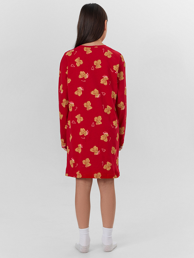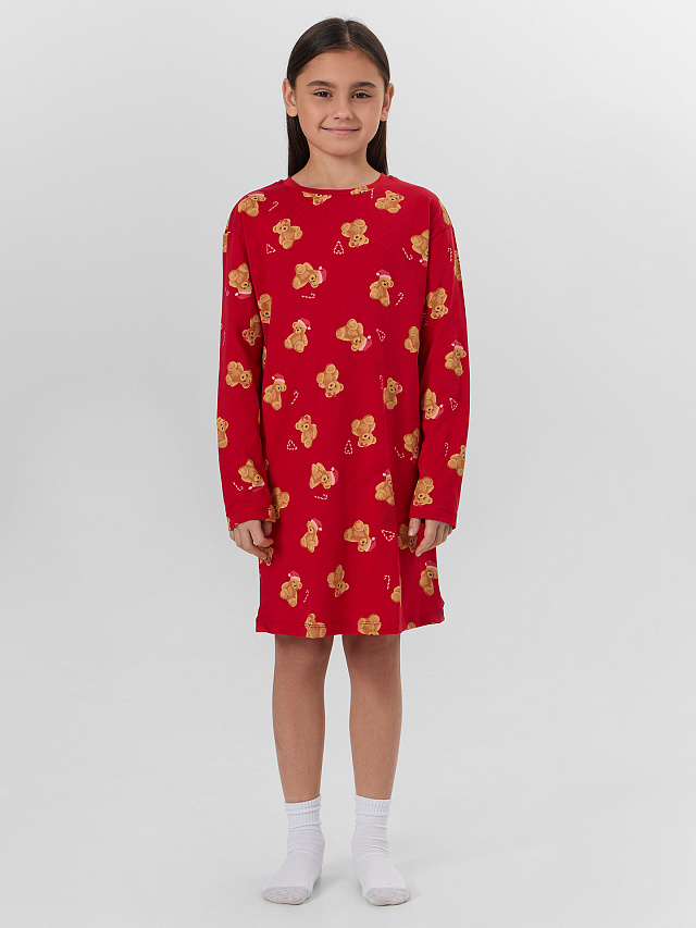 Красная ночная сорочка для девочек с новогодним принтом — прекрасный выбор для создания праздничного настроения! Модель прямого свободного кроя из мягкого хлопка обеспечивает комфорт на протяжении всей ночи.
