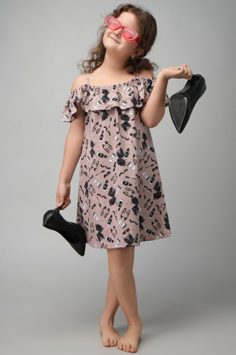 Трикотажный сарафан трапециевидного силуэта украшен воланом на резиночке в зоне груди и плеч. Хлопковое платье для девочки идеально подойдёт на лето — и для прогулок, и на каждый день.