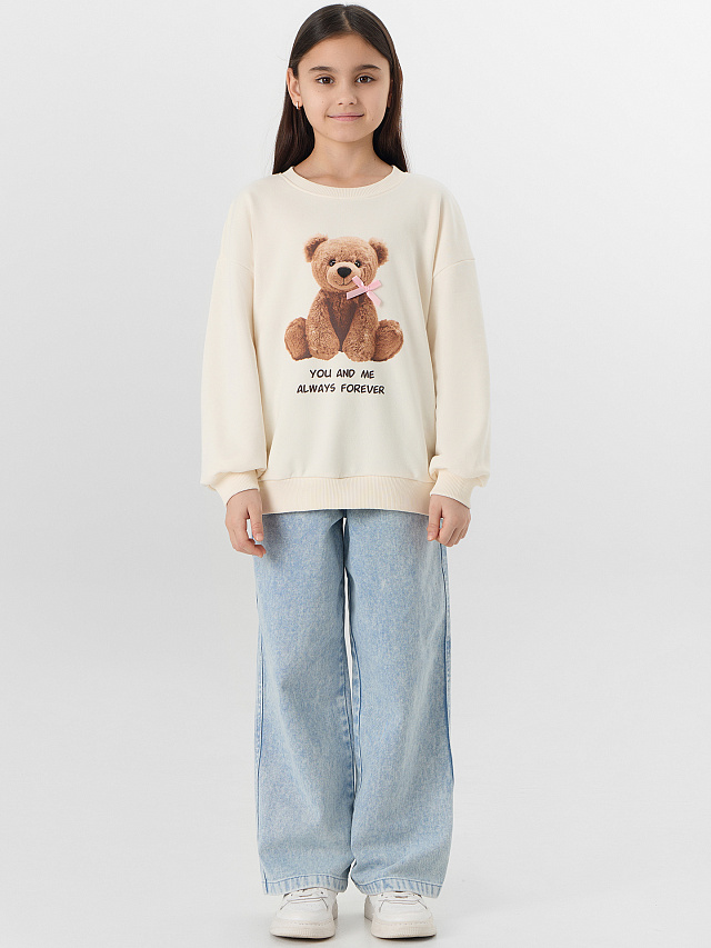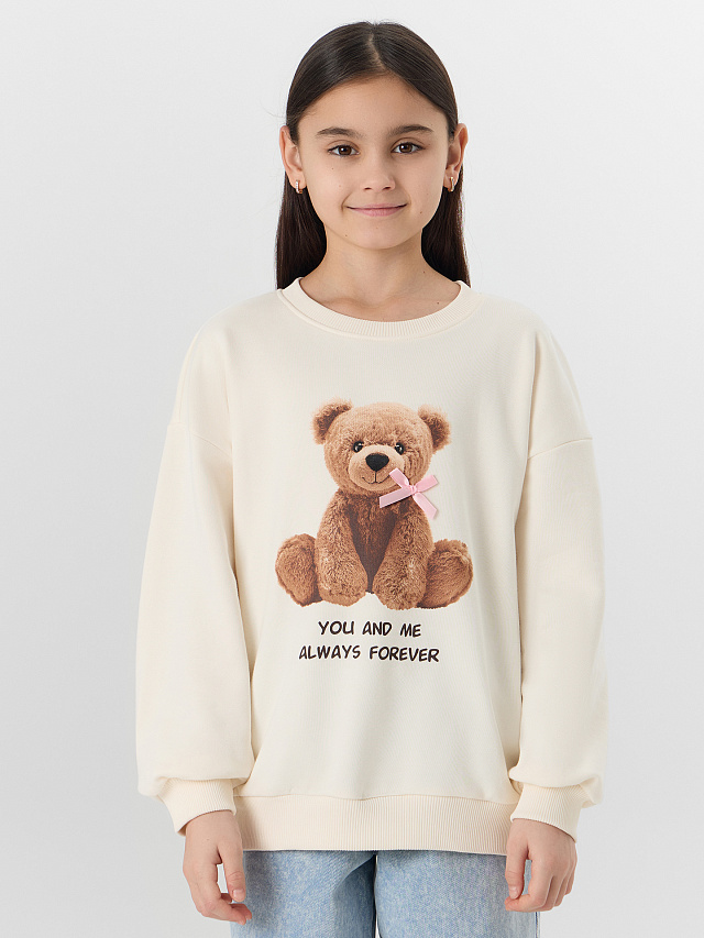 Бежевый свитшот для девочек с принтом мишки и надписью «Ты и я навсегда» — это нежная и уютная вещь для девочек. Он выполнен из мягкого футера, который сохраняет тепло и бережно облегает фигуру.