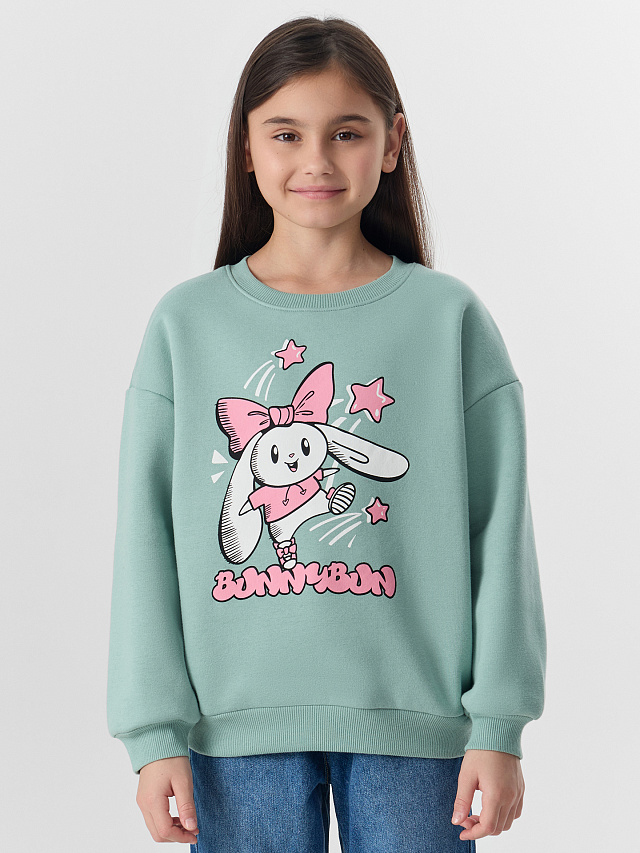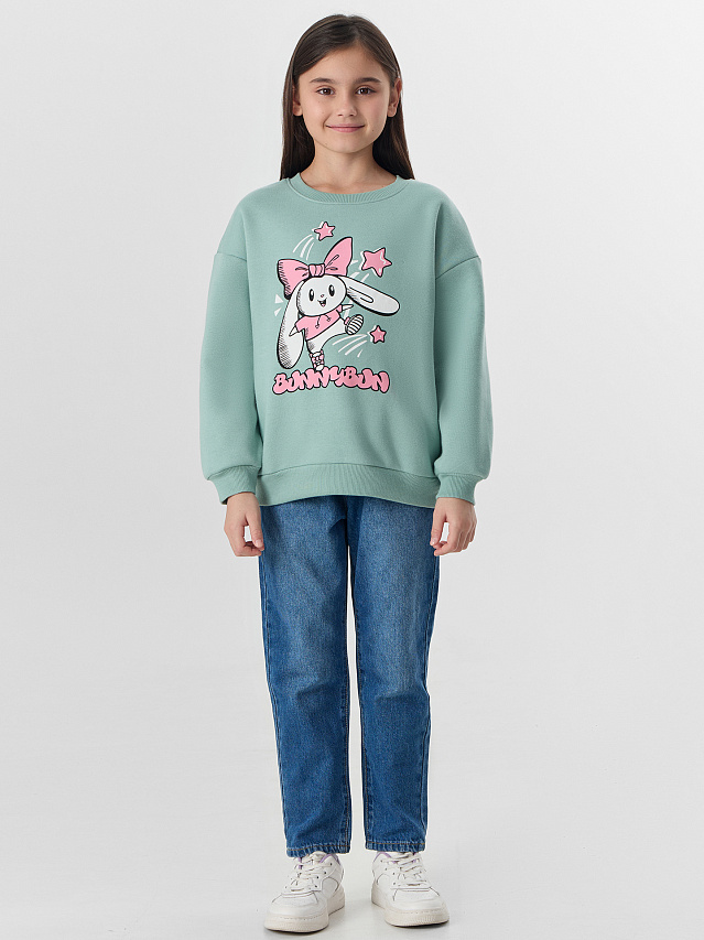 Зеленый свитшот для девочек с надписью «Зайчонок» создан для комфорта и уюта. Модель свободного кроя с мягким внутренним начесом согреет в прохладную погоду. Спущенная линия плеча и длинные рукава обеспечивают свободу движений. Круглая горловина, манжеты и пояс из эластичной рибаны сохраняют форму и обеспечивают удобную посадку.