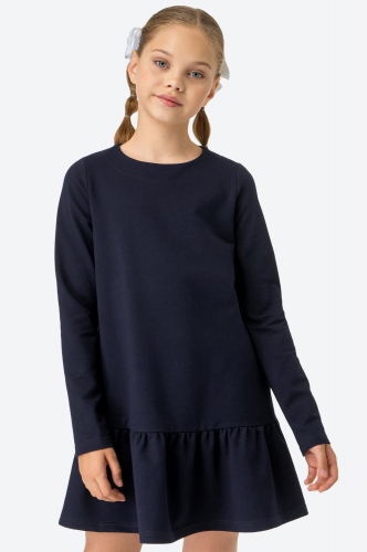 Темно-синий сарафан станет идеальной основой для твоих ярких школьных образов! Платье выполнено из футера двухнитки. Плотная, приятная к телу ткань отлично сохраняет форму и проста в уходе. Сарафан на широких бретелях без лишних застежек и замков имеет удобный А-силуэт. Надеть платье длиной до колена просто как раз-два-три.