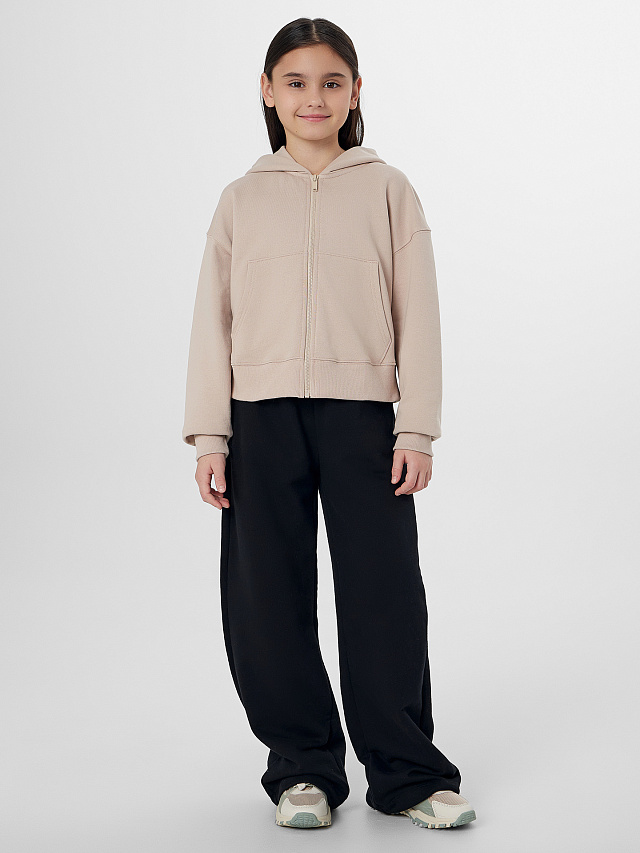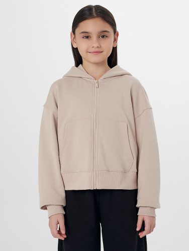 Бежевая толстовка на молнии с капюшоном для девочек станет любимой вещью в гардеробе для активного отдыха и повседневной носки. Удобная застежка-молния и практичный карман-кенгуру позволяют легко надевать изделие и хранить в нем нужные мелочи. Длинные рукава с мягкими манжетами и спущенная линия плеча обеспечивают комфорт и свободу движений.