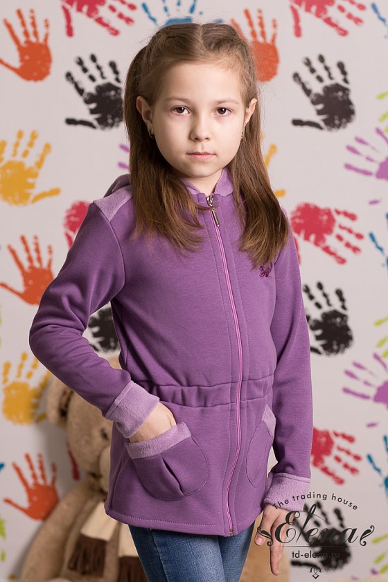 Толстовка с застёжкой на молнию выполнена из футер петли трёхнитки. По линии талии вставлена резинка, спереди два кармана. Рукав длинный, заканчивается отворотом. С левой стороны вышивка.