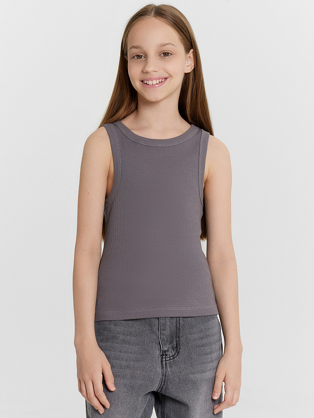 Топ для девочек из рибаны, облегающего силуэта, длиной ниже уровня талии. Перед и спинка цельнокроеные. Горловина круглая. Горловина и проймы окантованы широкой бейкой из основного полотна. Низ изделия обработан швом в подгибку.