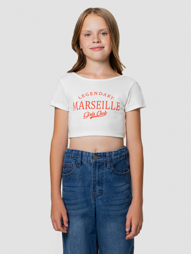 Укороченный топ для девочек с надписью “Marseille” — стильная вещь с настроением летнего побережья. Прилегающий силуэт подчеркивает аккуратность и современность, делая модель идеальной для активного дня, прогулок или городской капсулы. Круглая горловина обработана широкой окантовкой из основного материала — это усиливает эстетику и сохраняет форму при носке. Хлопковая основа обеспечивает комфорт и воздухопроницаемость, бережно прилегая к коже. Нижние срезы рукавов и самого изделия аккуратно обработаны швом вподгибку, что делает топ устойчивым к частым стиркам и сохраняет внешний вид. Надпись “Marseille” — изюминка дизайна, добавляющая французского шарма и путешественнического настроения. Такой топ легко сочетается с шортами, джинсами, юбками, создавая яркий и легкий летний образ.