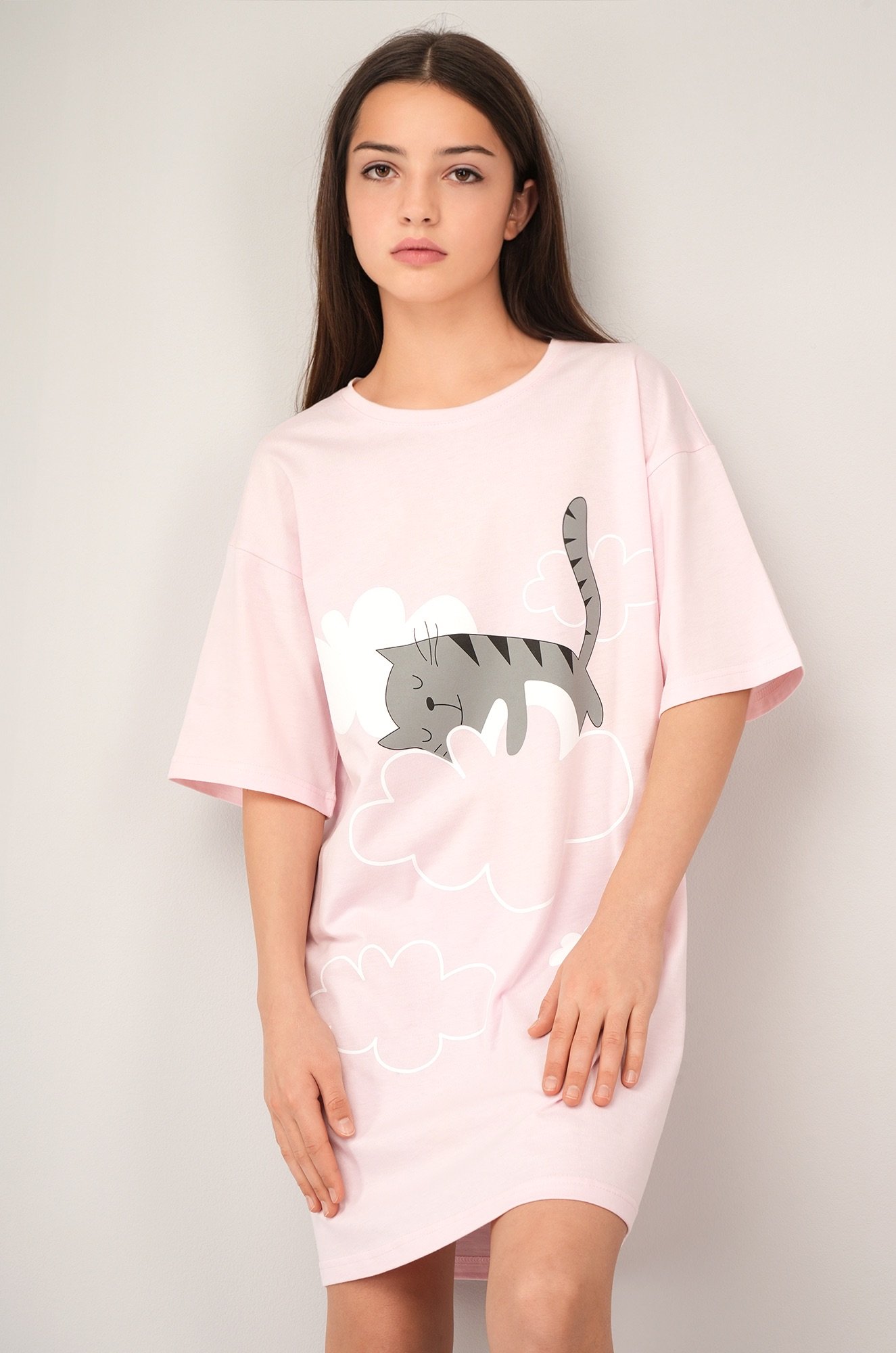Домашняя туника оверсайз с принтом Котик сразу поднимает настроение. Хлопковый трикотаж делает её невероятно уютной.
